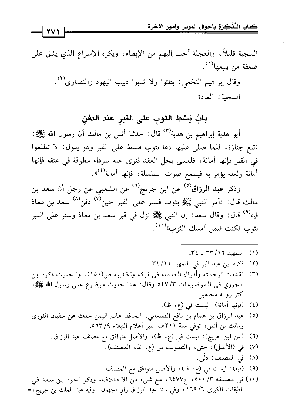 أبو هدبة إبراهيم بن هدبة قال: «حدثنا أنس بن مالك أن رسول الله صلى الله عليه وسلم تبع جنازة، فلما صلى عليها دعا بثوب فبسط على القبر وهو يقول: لا تتطلعوا في القبر فإنها أمانة فلعسى يحل العقدة فيرى حية سوداء متطوقة في عنقه فإنها أمانة ولعله يؤمر به فيستمع صوت السلسلة» .