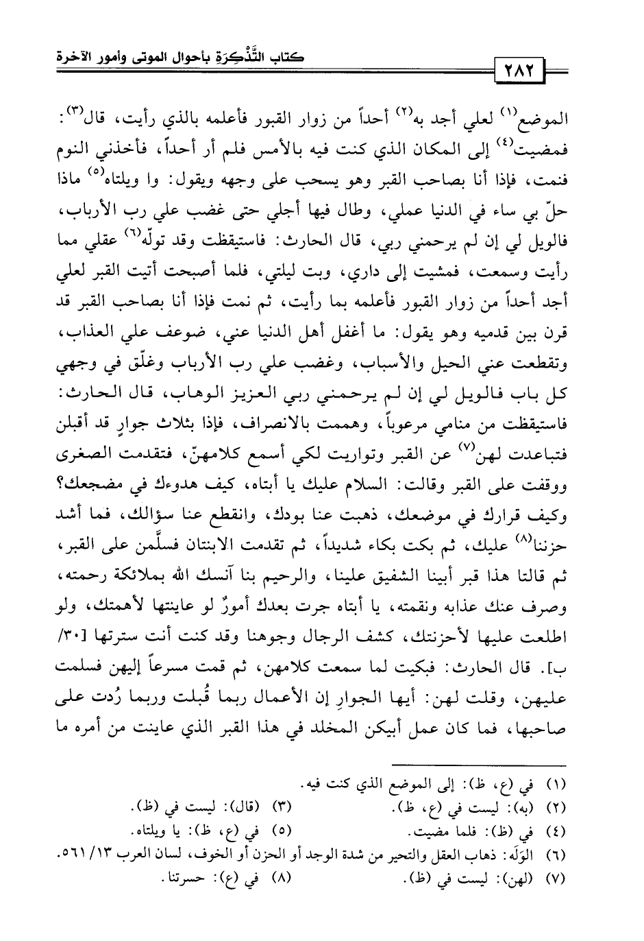 الموضع الذي كنت فيه لعلي أجد به أحداً من زوار القبور فأعلمه بالذي رأيت، قال: فمضيت إلى المكان الذي كنت فيه بالأمس فلم أر أحداً فأخذني النوم فنمت، فإذا أنا بصاحب القبر وهو يسحب على وجهه ويقول: يا ويلتاه ماذا حل بي.