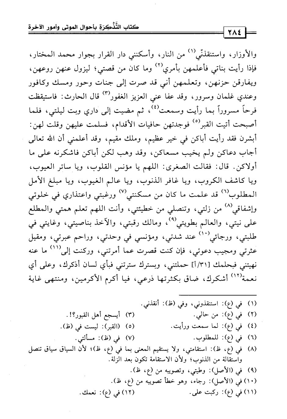 قال الحارث: فاسيقظت فرحاً مسروراً لما رأيت وسمعت، ثم مضيت إلى داري وبت ليلتي، فما أصبحت أتيت القبر فوجدتهن حافيات الأقدام فسلمت عليهن وقلت لهن: أبشرن فقد رأيت أباكن في خير عظيم وملك مقيم، وقد أعلمني أن الله تعالى أجاب دعاءكن ولم يخيب مسعاكن، وقد وهب لكن أباكن فاشكرنه على ما أولاكن.