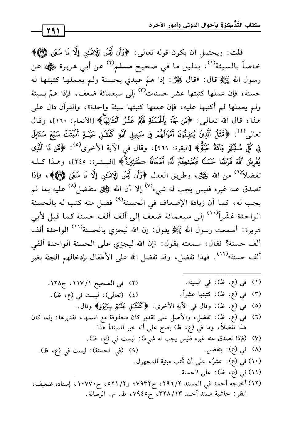 قال الله تعالى: {من جاء بالحسنة فله عشر أمثالها} وقال تعالى: {مثل الذين ينفقون أموالهم في سبيل الله كمثل حبة أنبتت سبع سنابل في كل سنبلة مائة حبة} الآية، وقال في الآية الأخرى: {كمثل جنة بربوة} وقال: {من ذا الذي يقرض الله قرضاً حسناً فيضاعفه له أضعافاً كثيرةً} وهذا كله تفضل من الله تعالى، وطريق العدل: {أن ليس للإنسان إلا ما سعى} ، إلا أن الله عز وجل يتفضل عليه بما لم يجب له كما أن زيادة الأضعاف فضل منه كتب لهم بالحسنة الواحدة: عشراً إلى سبعمائة ضعف إلى ألف ألف حسنة.