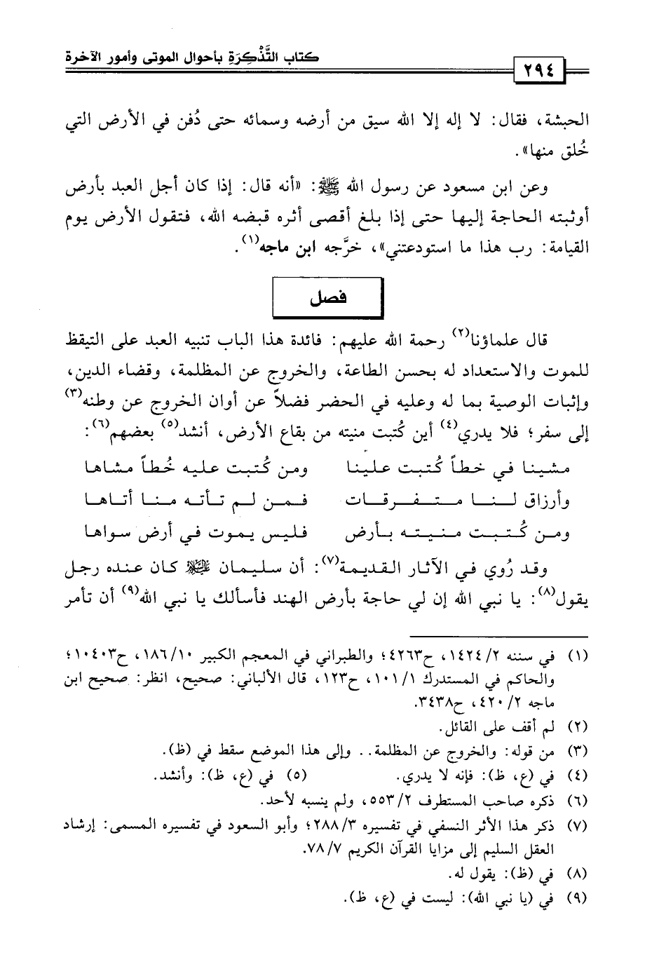 الحبشة، فقال: لا إله إلا الله سيق من أرضه وسمائه حتى دفن في الأرض التي خلق منها» وعن ابن مسعود «عن رسول الله صلى الله عليه وسلم أنه قال: إذا كان العبد بأرض أوثبته الحاجة إليها حتى إذابلغ أقصى أثره قبضه الله فتقول الأرض يوم القيامة: رب، هذا ما استودعتني» خرجه ابن ماجه أيضاً.