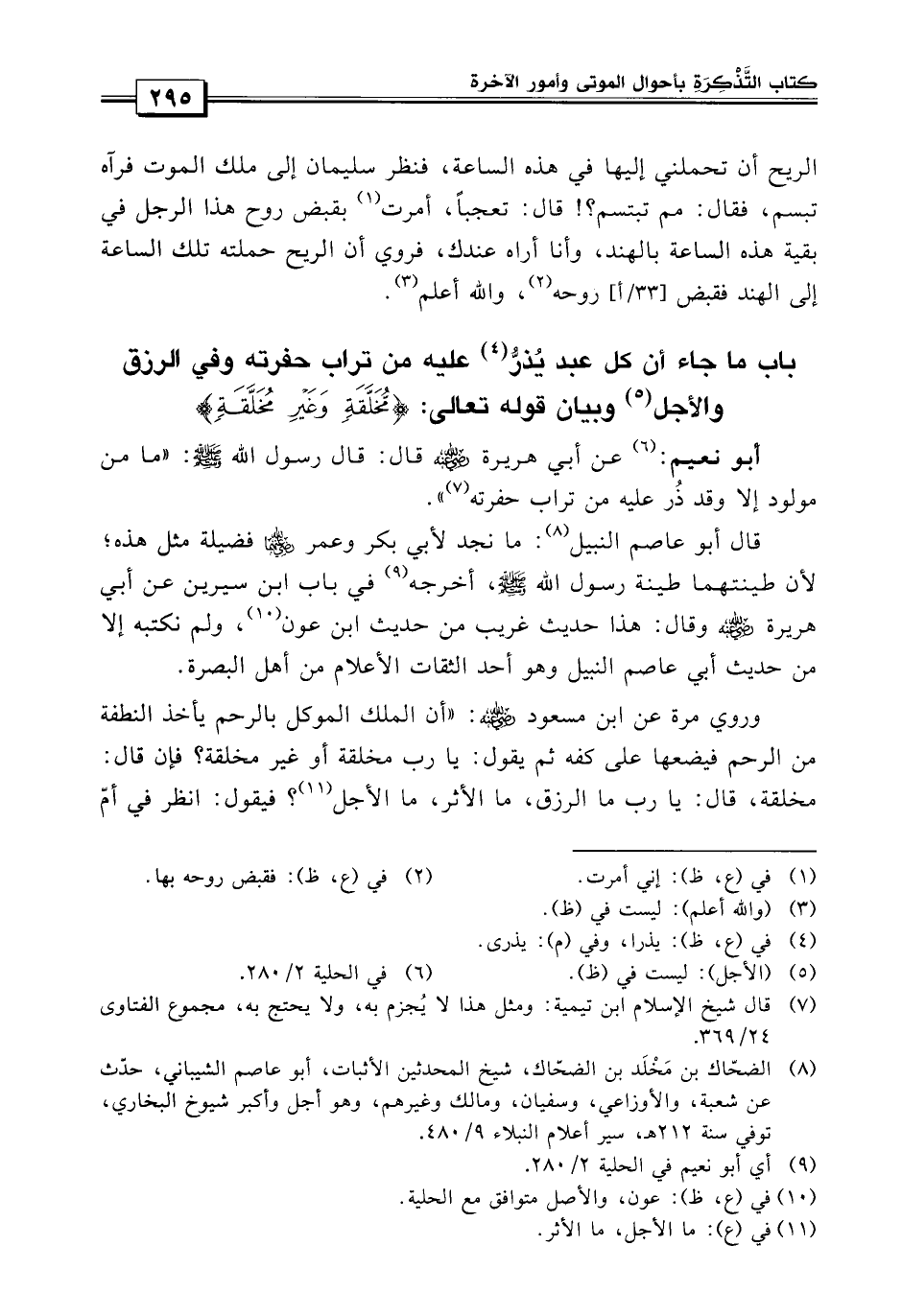 باب ما جاء أن كل عبد يذر عليه من تراب حفرته وفي الرزق والأجل، وبيان قوله تعالى مخلقةً وغير مخلقة