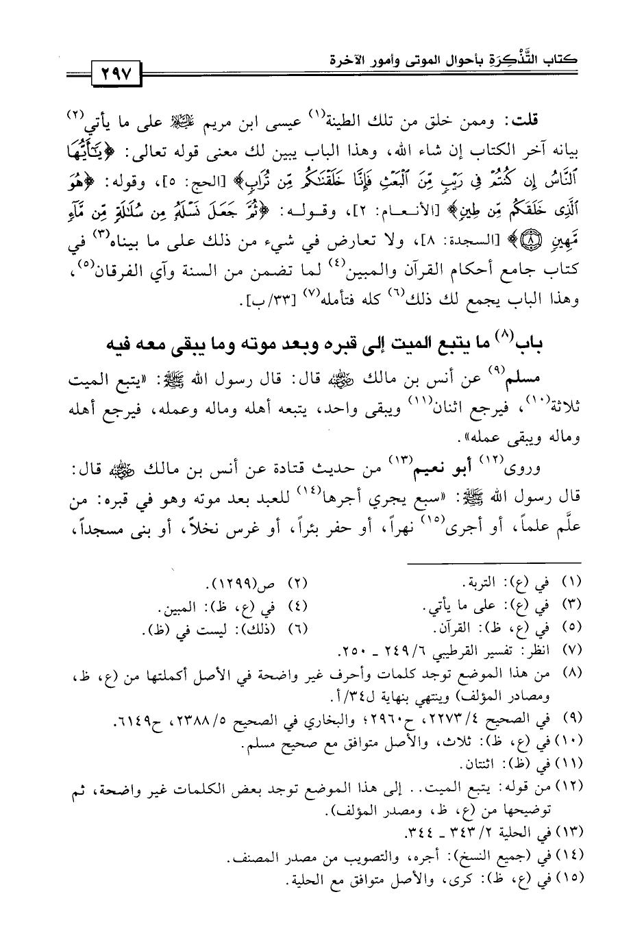 وروى أبو نعيم «من حديث قتادة عن أنس بن مالك قال: قال رسول الله صلى الله عليه وسلم سبع يجري أجرها للعبد بعد موته وهو في قبره: من علم علماً أو أجرى نهراً أو حفر بئراً أو غرس نخلاً أو بنى مسجداً