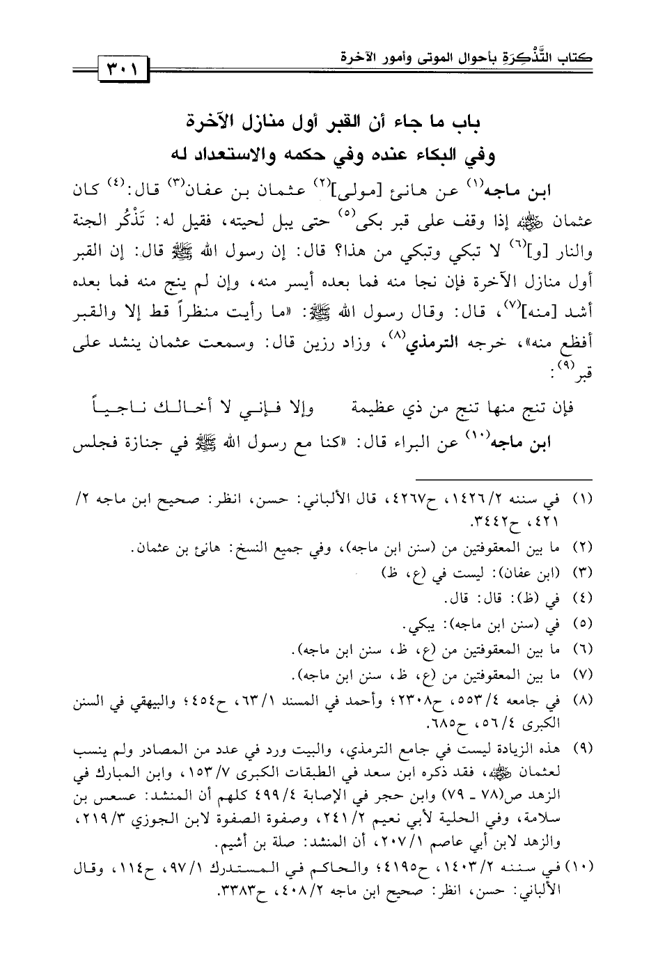 ابن ماجه عن هانىء بن عثمان قال: كان عثمان رضي الله عنه إذا وقف على قبر بكى حتى يبل لحيته فقيل له: تذكر الجنة والنار ولاتبكي وتبكي من هذا؟ قال «إن رسول الله صلى الله عليه وسلم قال: إن القبر أول منازل الآخرة.