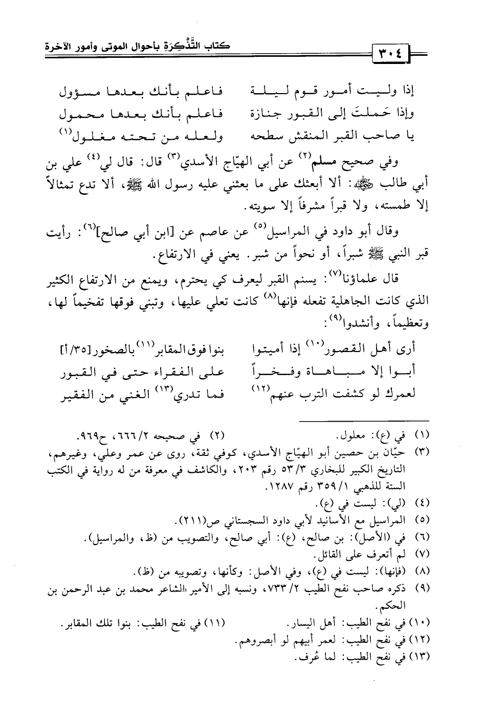 وفي صحيح مسلم، عن أبي الهياج الأسدي قال: قال علي بن أبي طالب رضي الله عنه: ألا أبعثك على ما بعثني عليه رسول الله صلى الله عليه وسلم؟ ألا تدع تمثال إلا طمسته، ولا قبراً مشرفاً إلا سويته.