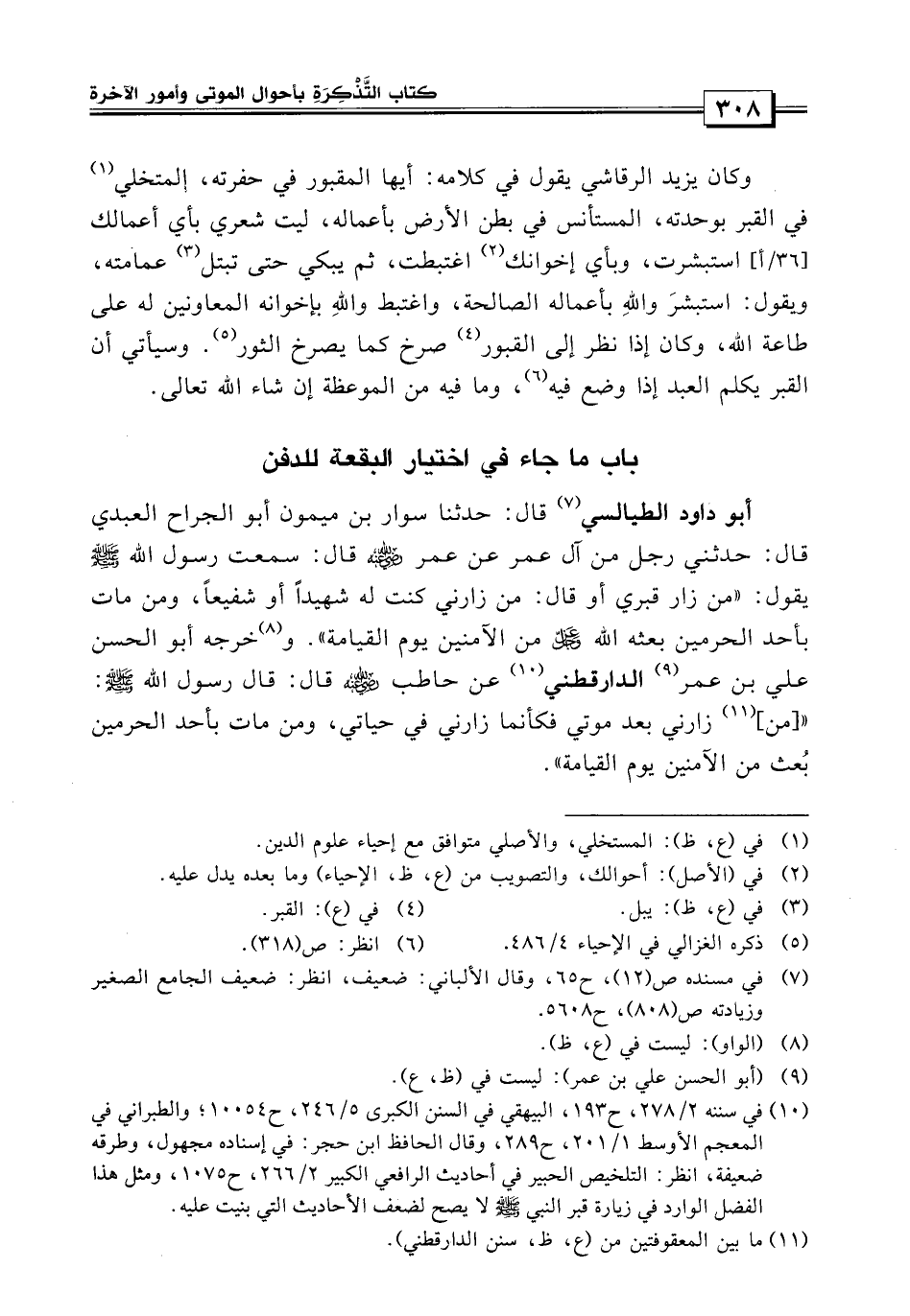 وكان يزيد الرقاشي يقول في كلامه: أيها المقبور في حفرته، المتخلى في القبر بوحدته، المستأنس في بطن الأرض بأعماله، ليت شعري بأي أعمالك استبشرت وبأي أحوالك اغتبطت، ثم يبكي حتى يبل عمامته، ويقول: استبشر ـ والله ـ بأعماله الصالحة، واغتبط ـ والله ـ بإخوانه المعاونين له على طاعة الله، وكان إذا نظر إلى القبر صرخ كما يصرخ الثور.