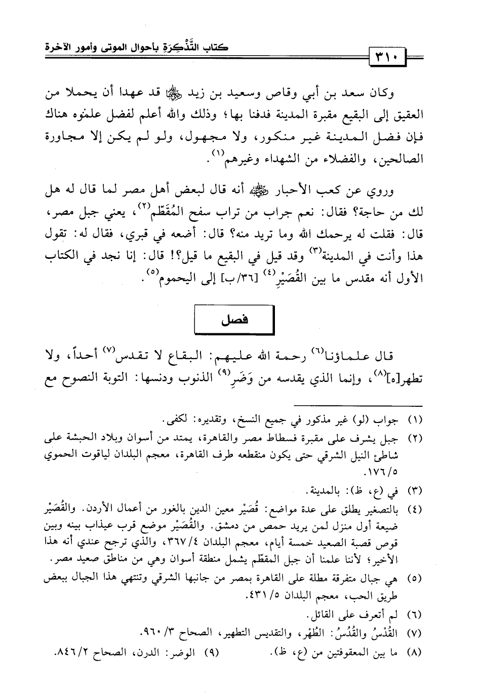 وروى عن كعب الأحبار أنه قال لبعض أهل مصر، لما قال له: هل لك من حاجة؟ فقال: نعم، جراب من تراب سفح المقطم، يعني: جبل مصر، قال: فقلت له: يرحمك الله، وما تريد منه؟ قال: أضعه في قبري، قال له: تقول هذا وأنت بالمدينة وقد قيل في البقيع ما قيل، قال: إنا نجد في الكتاب الأول أنه مقدس ما بين القصير إلى اليحموم..