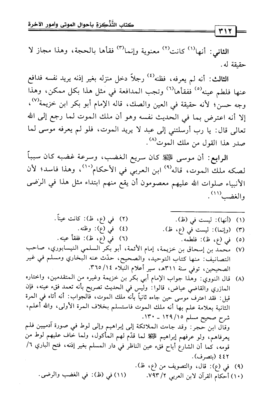 الرابع: أن موسى عليه السلام كان سريع الغضب، وسرعة غضبه كانت سبباً لصكه ملك الموت، قاله ابن العربي في الأحكام، وهذا فاسد، لأن الأنبياء معصومون أن يقع منهم ابتداء مثل هذا في الرضا والغضب.