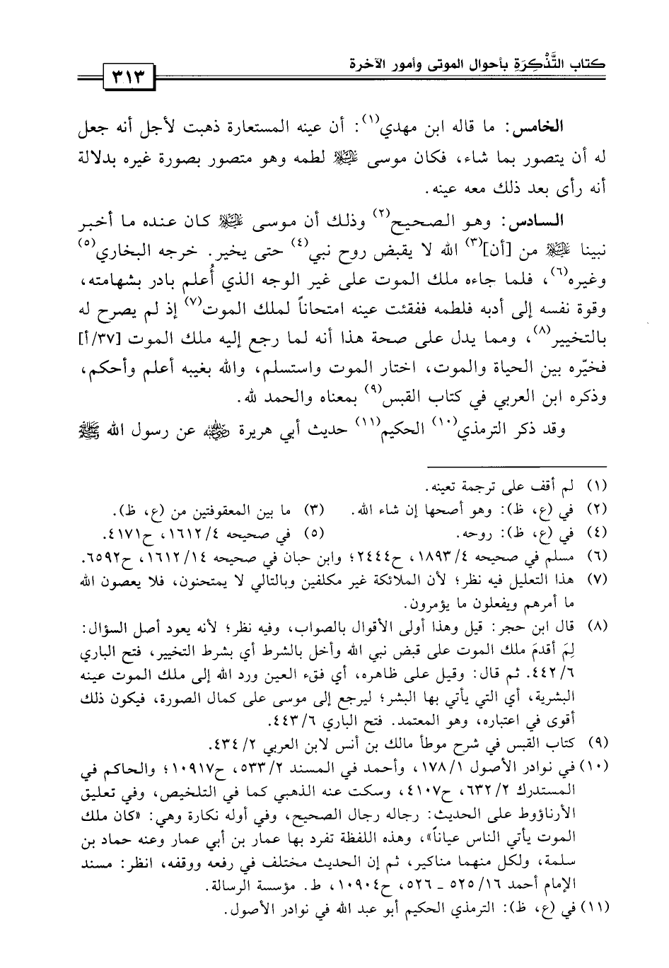 السادس: وهو أصحها إن شاء الله، وذلك أن موسى عليه السلام كان عنده ما أخبر تبيناً عليه السلام من أن الله تعالى لا يقبض روحه حتى يخيره ـ خرجه البخاري وغيره ـ فلما جاءه ملك الموت على غير الوجه الذي أعلم بادر بشهامته وقوة نفسه إلى أدبه.