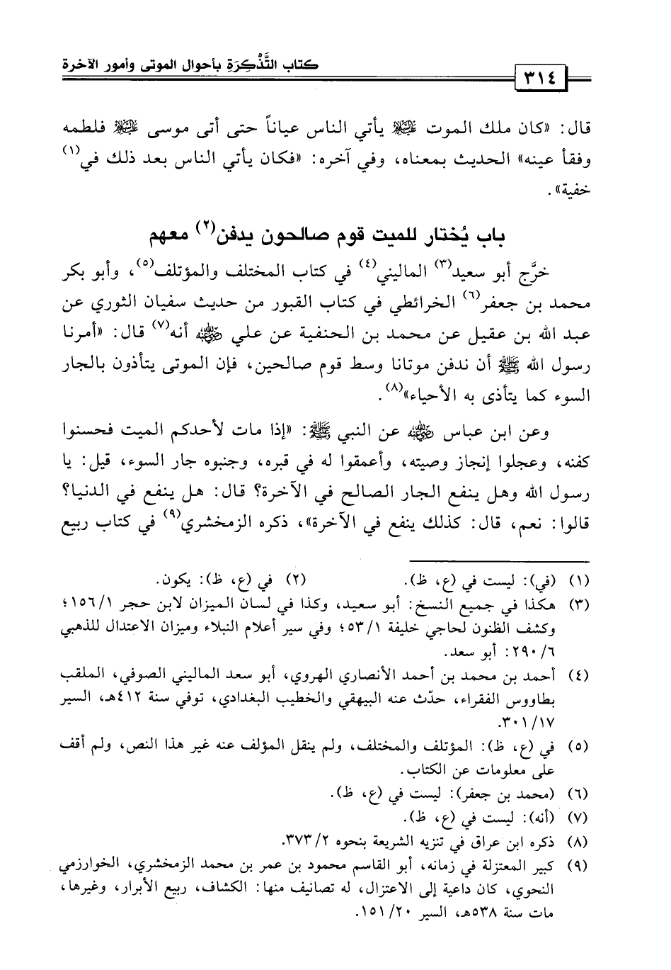خرج أبو سعيد الماليني في كتاب المؤتلف والمختلف، وأبو بكر الخرائطي في كتاب القبور، «من حديث سفيان الثوري، عن عبد الله بن محمد بن عقيل، عن ابن الحنفية، عن علي رضي الله عنه قال: أمرنا رسول الله صلى الله عليه وسلم أن ندفن موتانا وسط قوم صالحين.