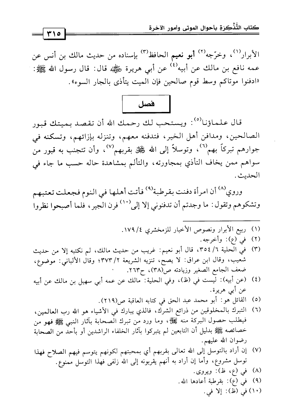 وخرجه أبو نعيم الحافظ بإسناده «من حديث مالك بن أنس عن عمه نافع بن مالك، عن أبيه عن أبي هريرة: قال: قال رسول الله صلى الله عليه وسلم: أدفنوا موتاكم وسط قوم صالحين.