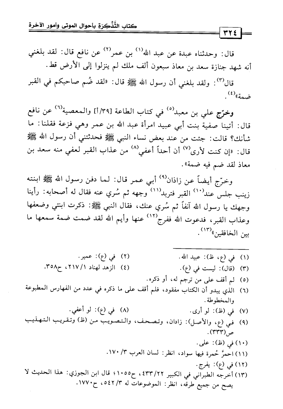 فقلنا: ما شأنك؟ قالت: جئت من عند بعض نساء النبي صلى الله عليه وسلم، فحدثتني أن رسول الله صلى الله عليه وسلم قال: «إن كنت لأرى أن أحداً لو أعفي من عذاب القبر، لأعفي منه سعد بن معاذ لقد ضم فيه ضمة» .