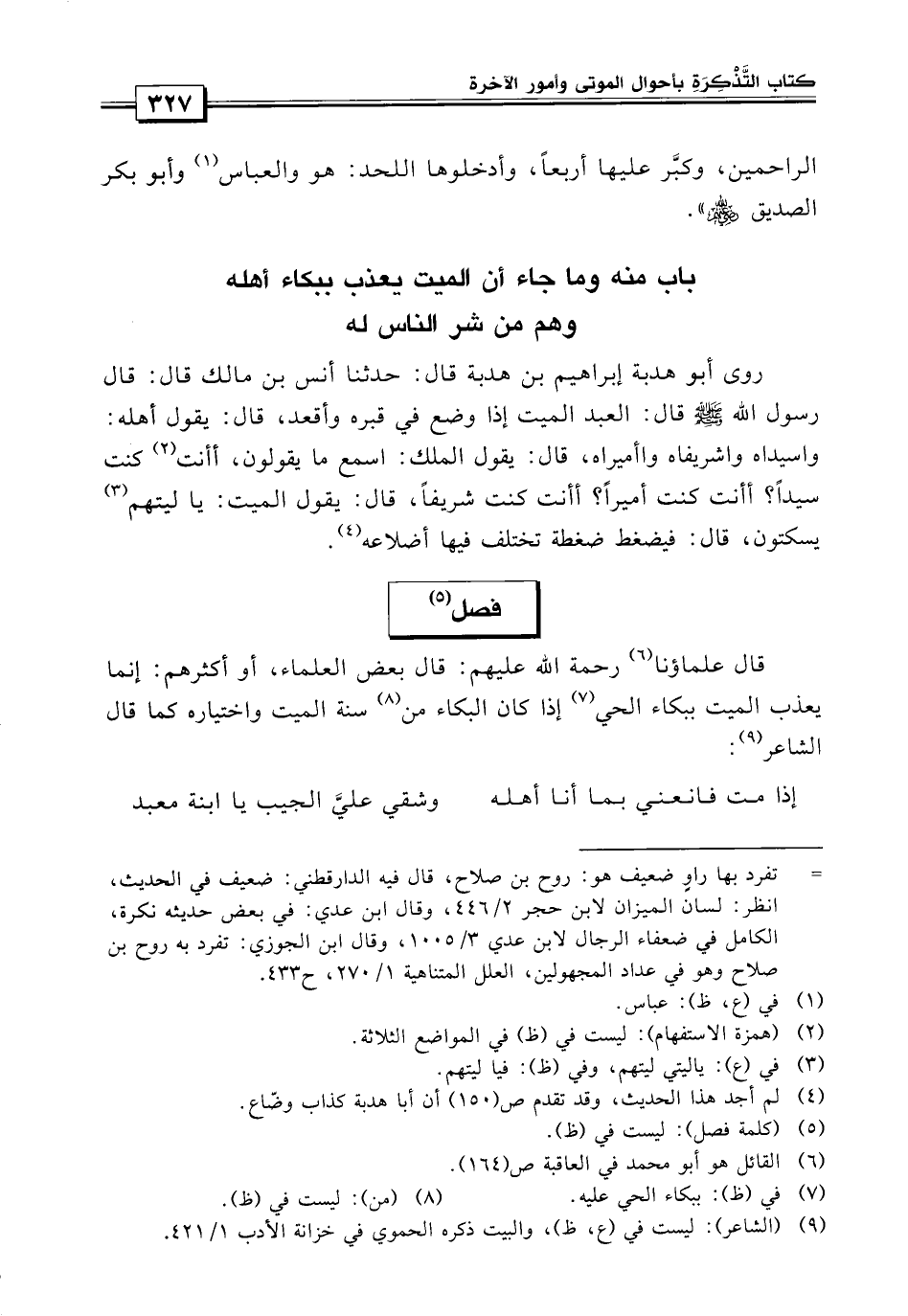 فصل قال علماؤنا رحمة الله عليهم: قال بعض العلماء أو أكثرهم: إنما يعذب الميت ببكاء الحي.