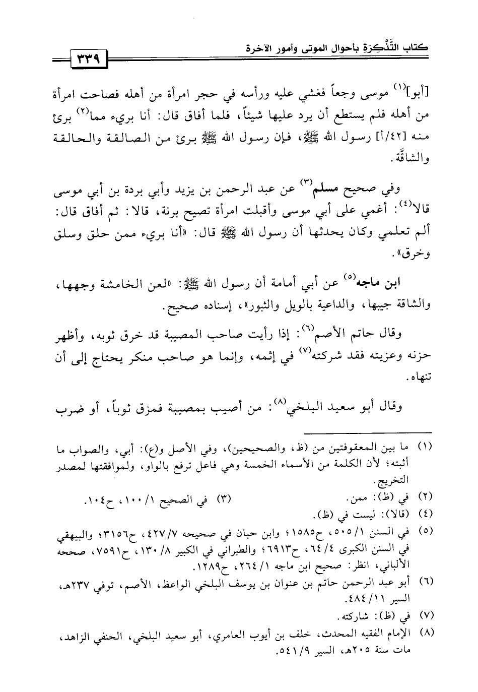 وفي صحيح مسلم عن عبد الرحمن بن يزيد وأبي بردة بن أبي موسى قالا: أغمي على أبي موسى وأقبلت امرأته تصيح برنة، قالا: ثم أفاق، قال: ألم تعلمي ـ وكان يحدثها ـ أن رسول الله صلى الله عليه وسلم قال: «أنا بريء ممن حلق وسلق وخرق» ؟ .
