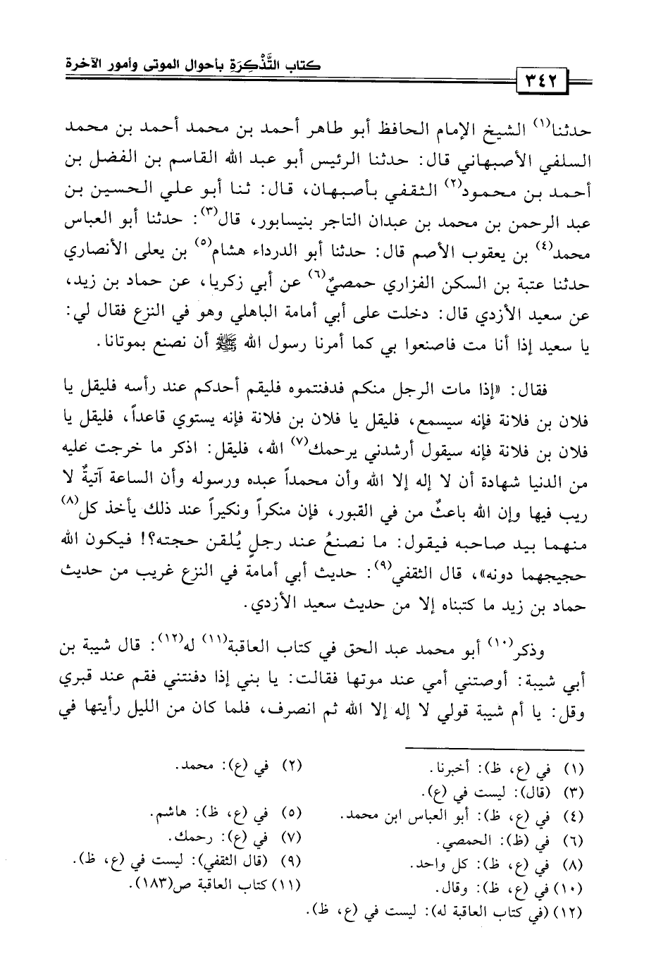 فليقل يا فلان ابن فلانة فإنه سيقول: أرشدنا يرحمك الله فلقيل: اذكر ما خرجت عليه من الدنيا: شهادة أن لا إله إلا الله، وأن محمداً عبده ورسوله، وأن الساعة آتية لا ريب فيها، وأن الله باعث من في القبور، فإن منكر ونكيراً عند