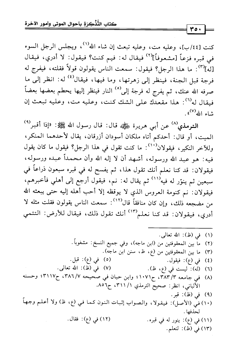الترمذي» عن أبي هريرة قال: قال رسول الله صلى الله عليه وسلم: إذا أقبر الميت ـ أو قال أحدكم ـ أتاه ملكان أسودان أزرقان يقال لأحدهما المنكر.