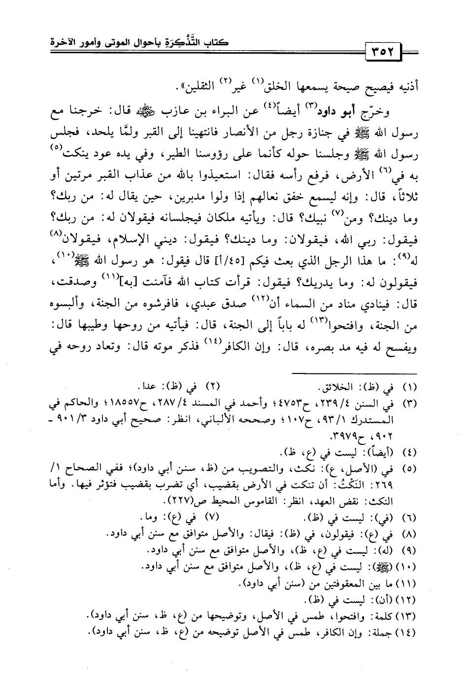فانتهينا إلى القبر ولما يلحد، فجلس رسول الله صلى الله عليه وسلم وجلسنا حوله كأنما على رؤوسنا الطير وفي يده عود ينكت به في الأرض فرفع رأسه فقال: استعيذوا بالله من عذاب القبر مرتين أو ثلاثاً، قال: وإنه ليسمع خفق نعالهم إذا ولوا مدبرين حين يقال له: من ربك؟ وما دينك؟ ومن نبيك؟ قال: ويأتيه ملكان فيجلسانه فيقولان له: من ربك؟ فيقول: ربي الله، فيقولان: ما دينك؟ فيقول: ديني الإسلام، فيقولان: ما هذا الرجل الذي بعث فيكم؟ فيقول: هو رسول الله، فيقولان له: وما يدريك؟ قال: قرأت كتاب الله فآمنت وصدقت «قال: فينادي مناد من السماء: أن صدق عبدي فأفرشوه من الجنة.