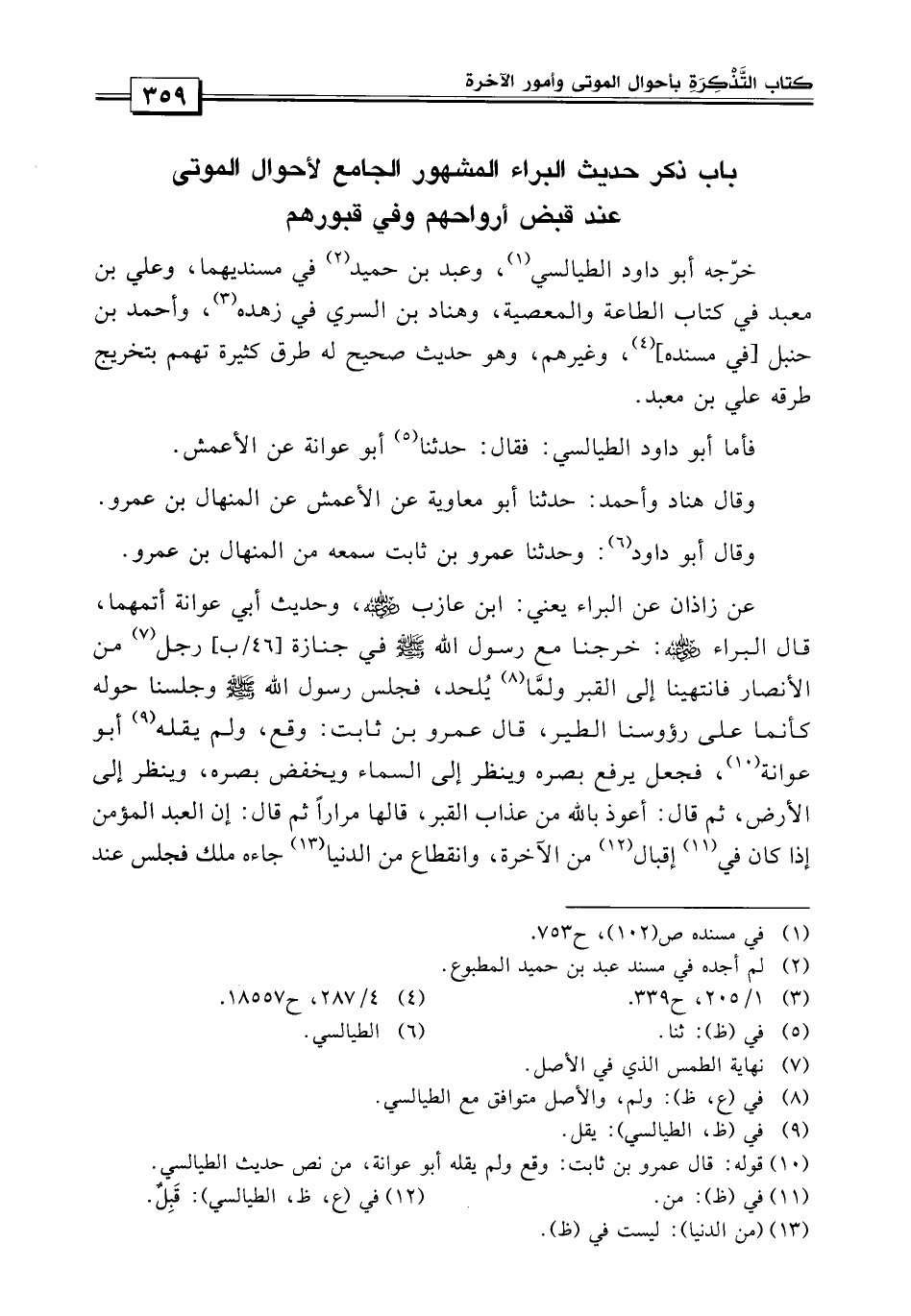 باب ذكر حديث البراء المشهور الجامع لأحوال الموتى عند قبض أرواحهم وفي قبورهم