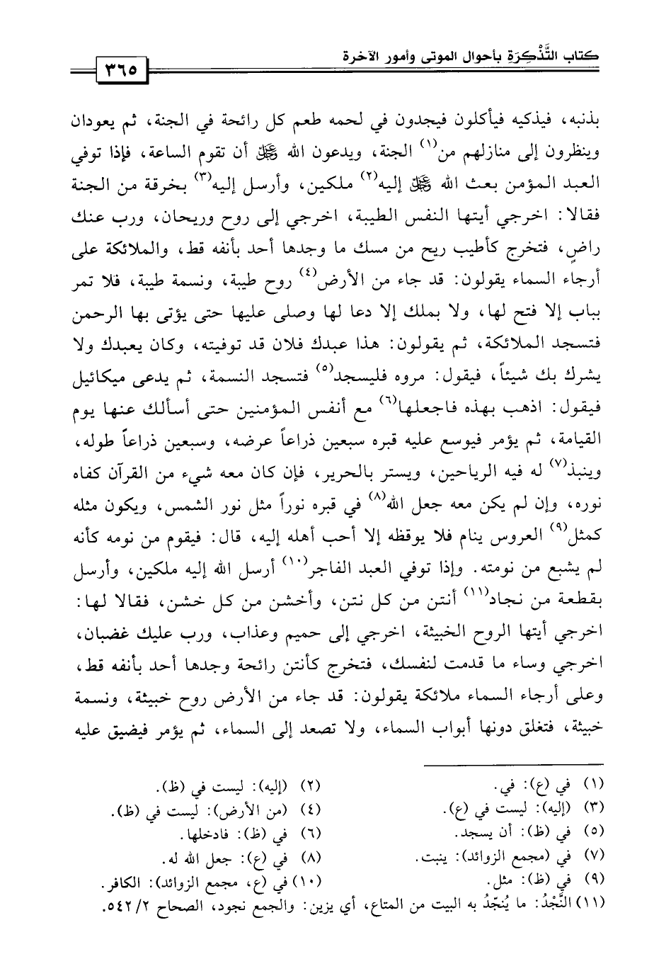 بذنبه فيذكيه فيأكلون فيجدون في لحمه طعم كل رائحة في الجنة ثم يعودون وينظرون إلى منازلهم من الجنة، ويدعون الله عز وجل أن تقوم الساعة، فإذا توفي العبد المؤمن بعث الله عز وجل إليه ملكين وأرسل إليه بخرقة من الجنة، فقال: اخرجي أيتها النفس المطمئنة اخرجي إلى روح وريحان ورب عنك غير غضبان، فتخرج كأطيب ريح من مسك ما وجدها أحد بأنفه قط، والملائكة على أرجاء السماء يقولون قد جاء من قبل الأرض روح طيبة ونسمة طيبة فلا تمر بباب إلا فتح لها ولا بملك إلا دعا لها وصلى عليها، حتى يؤتى بها الرحمن فتسجد الملائكة ثم يقولون: هذا عبدك فلان قد توفيته وكان يعبدك لا يشرك بك شيئاً، فيقول مروه فليسجد فتسجد النسمة، ثم يدعى ميكائيل فيقول: اذهب بهذه فاجعلها مع أنفس المؤمنين حتى أسألك عنها يوم القيامة ثم يؤمر فيوسع عليه قبره سبعين ذراعاً عرضه وسبعين ذراعاً طوله، وينبذ له فيه الرياحين ويستر بالحرير، فإن كان معه شيء من القرآن كفاه نوره.