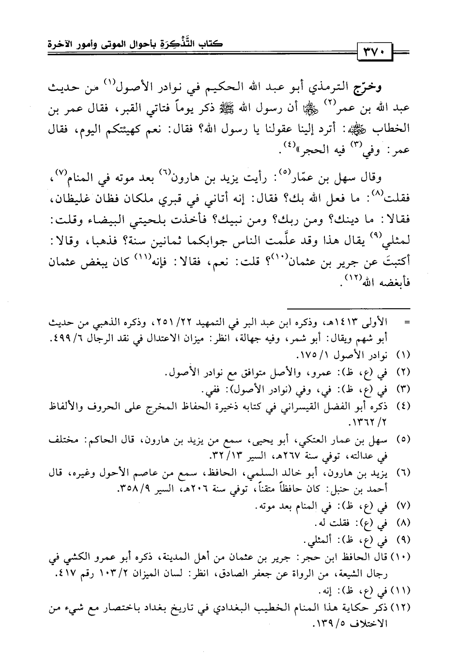 وخرج الترمذي الحكيم أبو عبد الله في نوادر الأصول من حديث «عبد الله بن عمر أن رسول الله صلى الله عليه وسلم ذكر يوماً فتاني القبر.