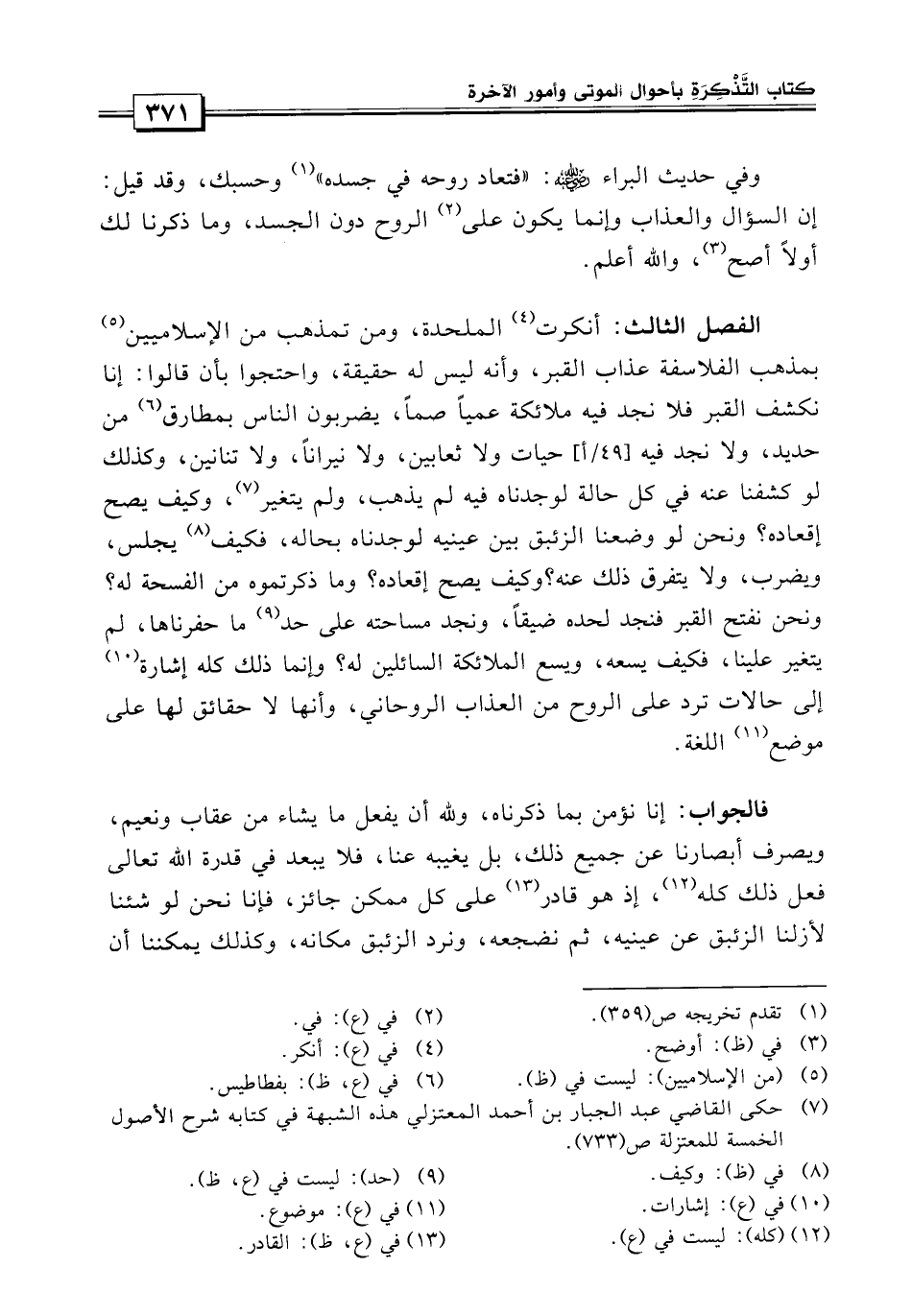 وكذلك لو كشفنا عنه في كل حالة لوجدناه فيه لم يذهب ولم يتغير، وكيف يصح إقعاده ونحن لو وضعنا الزئبق بين عينيه لوجدناه بحاله، فكيف يجلس ويضرب ولا يتفرق ذلك؟ وكيف يصح إقعاده وما ذكرتموه من الفسحة؟ ونحن نفتح القبر فنجد لحده ضيقاً ونجد مساحته على حد ما حفرناها لم يتغير علينا، فكيف يسعه ويسع الملائكة السائلين له؟ وإنما ذلك كله إشارة إلى حالات ترد على الروح من العذاب الروحاني، وإنها لا حقائق لها على موضوع اللغة.