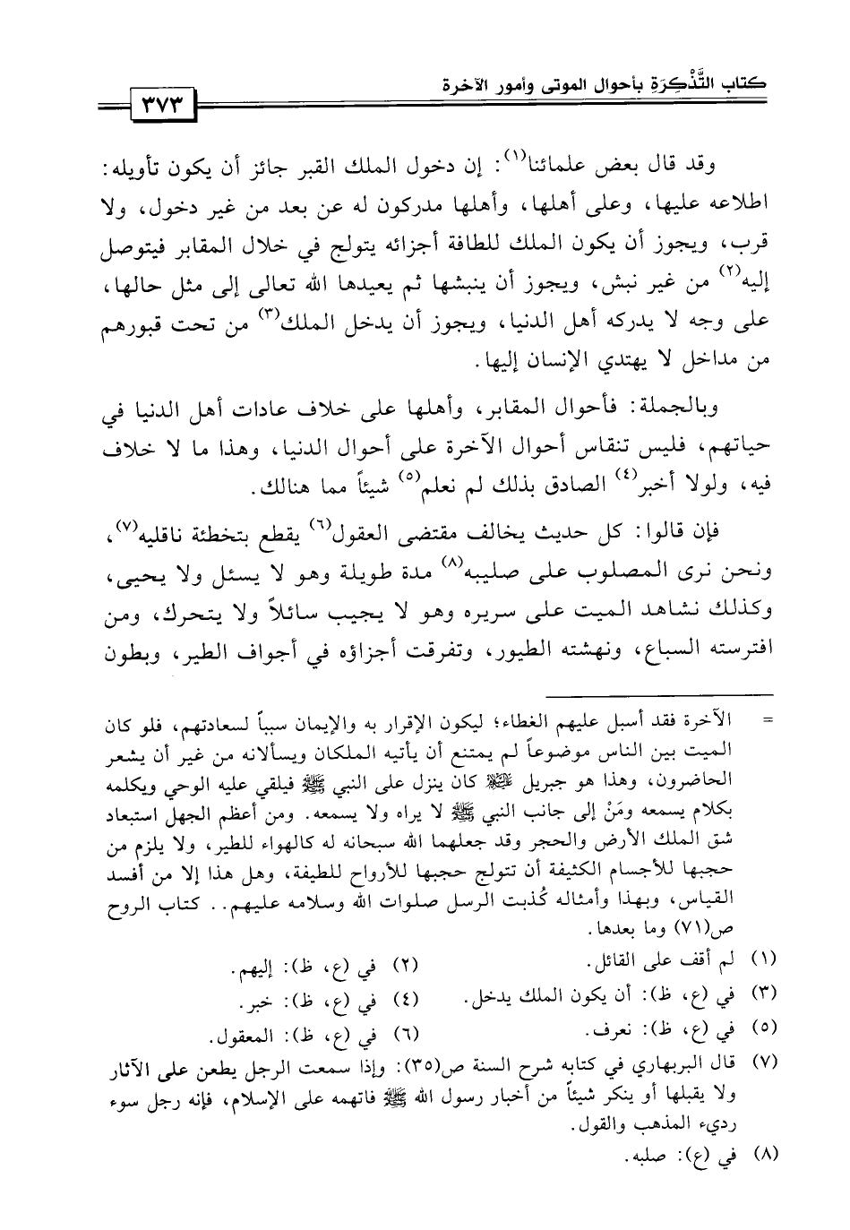 وبالجملة: فأحوال المقابر وأهلها على خلاف عادات أهل لدنيا في حياتهم فليس تنقاس أحوال الآخرة على أحوال الدنيا.