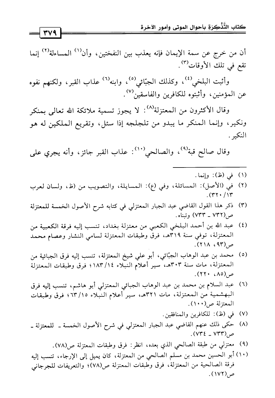 أن خرج عن سلمة الإيمان، فإنه يعذب بين النفختين، وأن المساءلة إنما تقع في تلك الأوقات وأثبت البلخي وكذلك الجبائي وابنه: عذاب القبر.