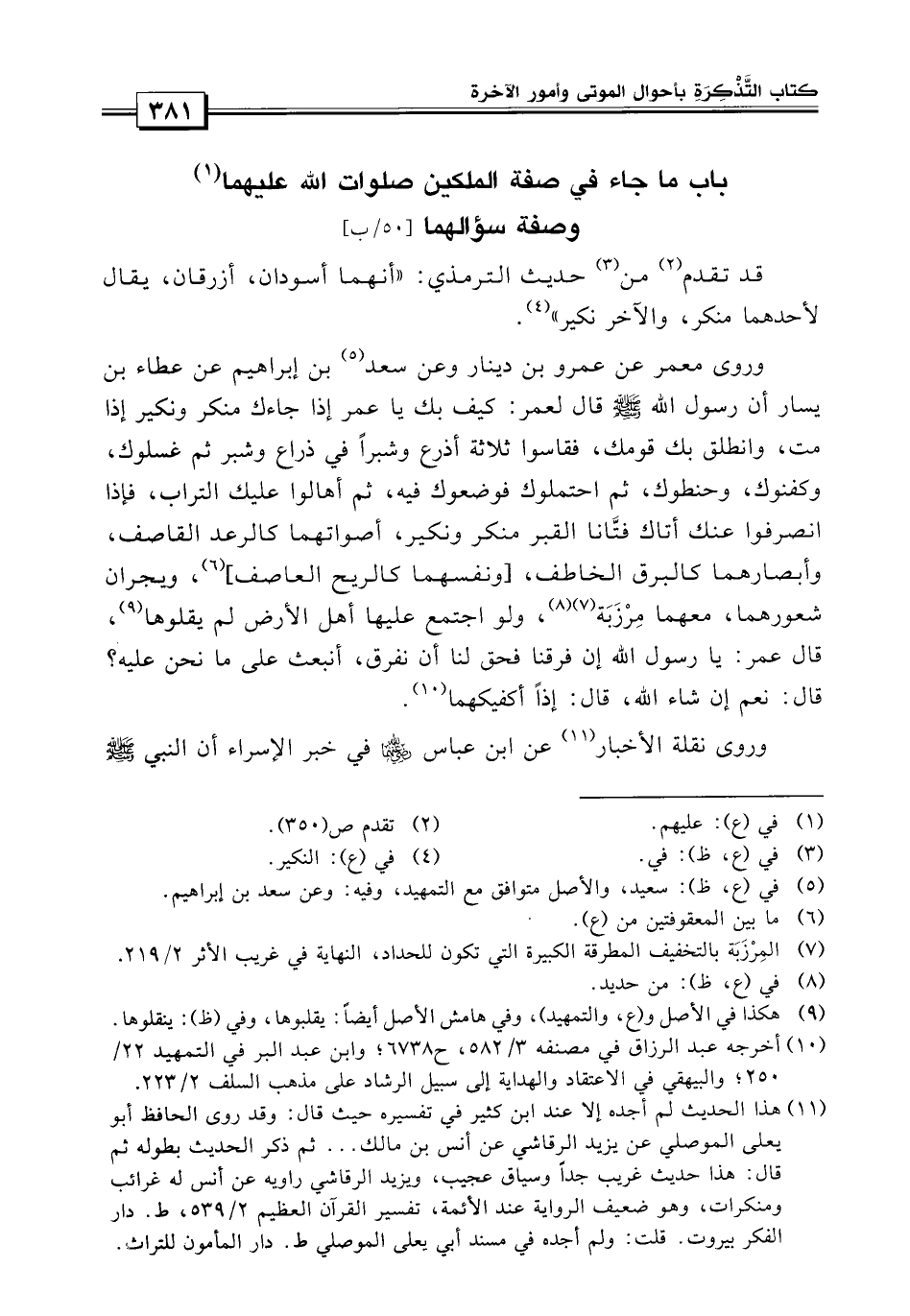 يقال لأحدهما: منكر، وللآخر: النكير، «وروى معمر عن عمرو بن دينار وعن سعد بن إبراهيم عن عطاء ابن يسار أن رسول الله صلى الله عليه وسلم قال لعمر: كيف بك يا عمر إذا جاءك منكر ونكير إذا مت وانطلق بك إلى قومك وقاسوا ثلاثة أذراع وشبر في ذارع وشبر، ثم غسلوك وكفوك وحنطوك، ثم احتملوك فوضعوك فيه، ثم أهالوا عليك التراب؟ فإذا انصرفوا عنك أتاك فتانا القبر: منكر ونكير أصواتهما كالرعد القاصف وأبصارهما كالبرق الخاطف، يجران شعورهما.