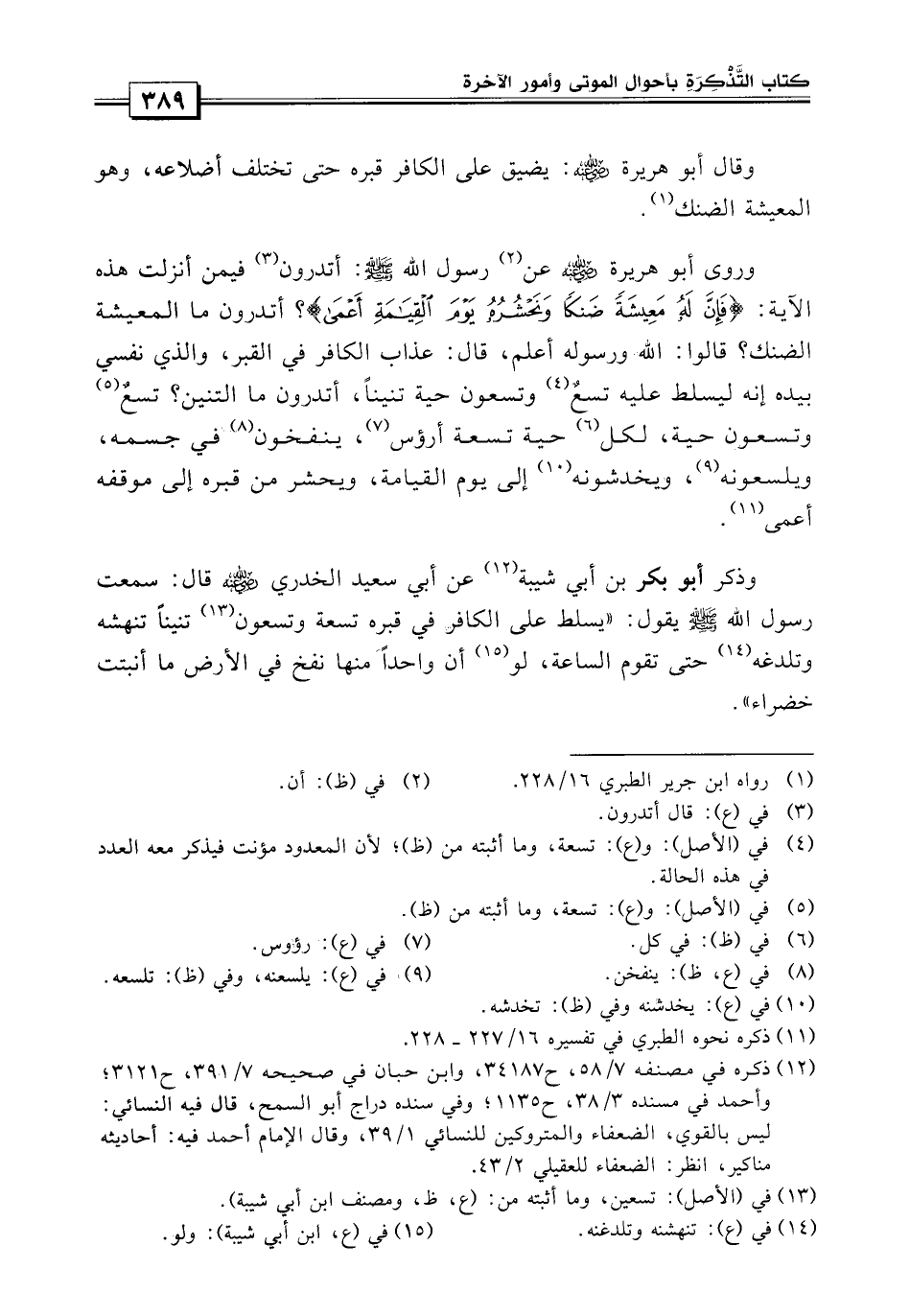 وذكر أبو بكر بن أبي شيبة «عن أبي سعيد الخدري قال: سمعت رسول الله صلى الله عليه وسلم يقول: يسلط على الكافر في قبره تسعة وتسعون تنيناً تنهشه وتلدغه حتى تقوم الساعة ولو أن واحداً منها نفخ في الأرض ما أنبتت خضراً»