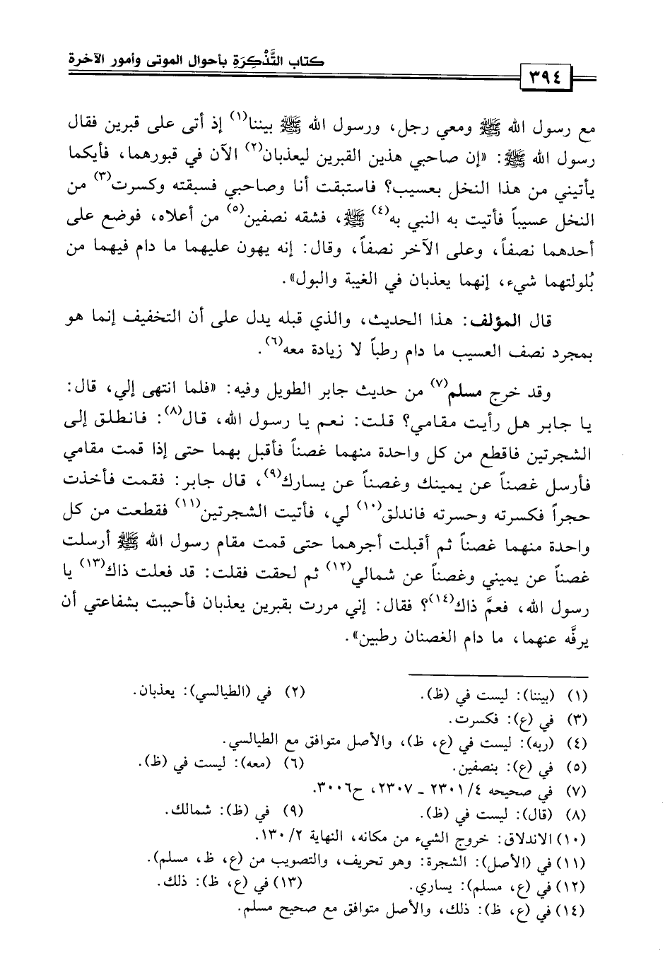 فقال رسول الله صلى الله عليه وسلم: إن صاحبي هذين القبرين ليعذبان الآن في قبورهما فأيكما يأتيني من هذا النخل بعسيب؟ فاستبقت أنا وصاحبي فسبقته وكسرت من النخل عسيباً.