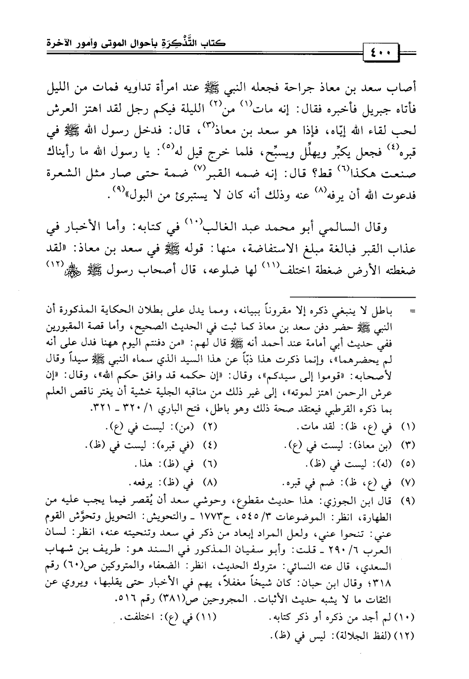 وقال السالمي أبو محمد عبد الغالب في كتابه، وأما أخبار في عذاب القبر فبالغه مبلغ الاستفاضة منها قوله صلى الله عليه وسلم في سعد بن معاذ: «لقد ضغطته الأرض اختلفت لها ضلوعه» قال أصحاب رسول الله صلى الله عليه وسلم ورضي عنهم: