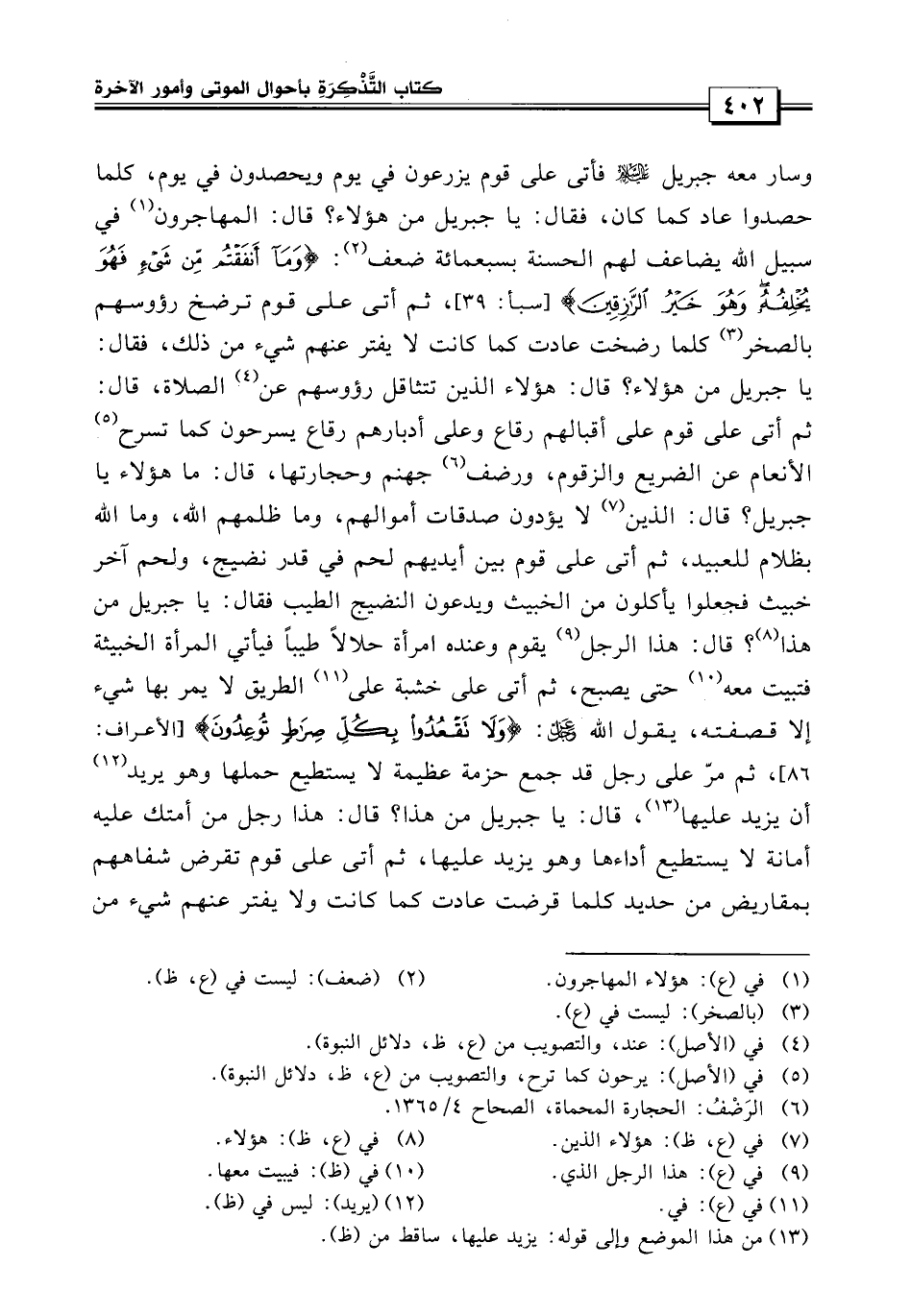 وسار معه جبريل فأتى على قوم يزرعون في كل يوم ويحصدون في كل يوم كلما حصدوا عاد كما كان فقال يا جبريل من هؤلاء؟ فقال المهاجرون في سبيل الله تضاعف لهم الحسنة بسبعمائة ضعف {وما أنفقتم من شيء فهو يخلفه وهو خير الرازقين} ثم أتى على قوم ترضخ رؤوسهم بالصخر كلما رضخت عادت كما كانت لا يفتر عنهم شيء من ذلك.