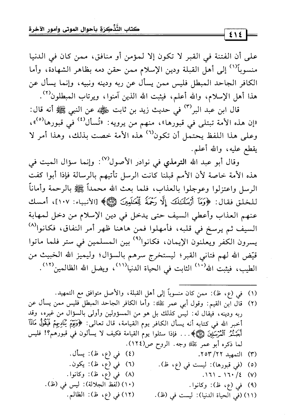 قال ابن عبد البر وفي حديث زيد بن ثابت عن النبي صلى الله عليه وسلم أنه قال: «إن هذه الأمة تبتلى في قبورها» ومنهم من يرويه تسأل.