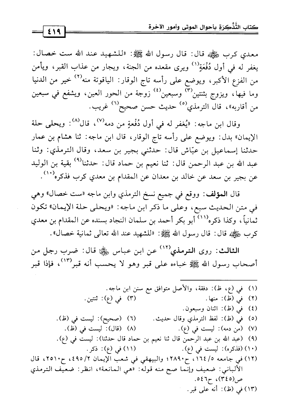 قال المؤلف ووقع في جميع نسخ الترمذي وابن ماجه: [ست خصال] وهي في متن الحديث: [سبع] وعلى ما ذكر ابن ماجه: [ويحلى بحلة الإيمان] تكون ثمانية، وكذا ذكره «أبو بكر أحمد بن سليمان النجاد بسنده عن المقدام بن معدي كرب قال: قال رسول الله صلى الله عليه وسلم: للشهيد عند الله ثمانية خصال» .