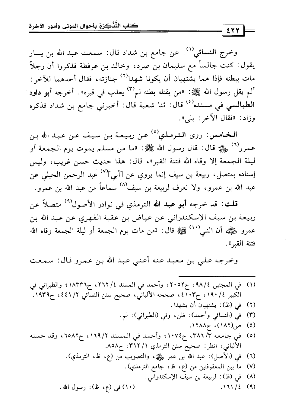 الخامس: روى الترمذي، «عن ربيعة بن سيف، عن عبد الله بن عمرو قال: قال رسول الله صلى الله عليه وسلم: ما من مسلم يموت يوم الجمعة، أو ليلة الجمعة إلا وقاه الله فتنة القبر» ، قال هذا حديث حسن غريب، وليس إسناده بمتصل ربيعة بن سيف إنما يروي عن عبد الرحمن الحبلي عن عبد الله بن عمرو، ولا نعرف لربيعة بن سيف سماعاً من عبد الله بن عمرو.