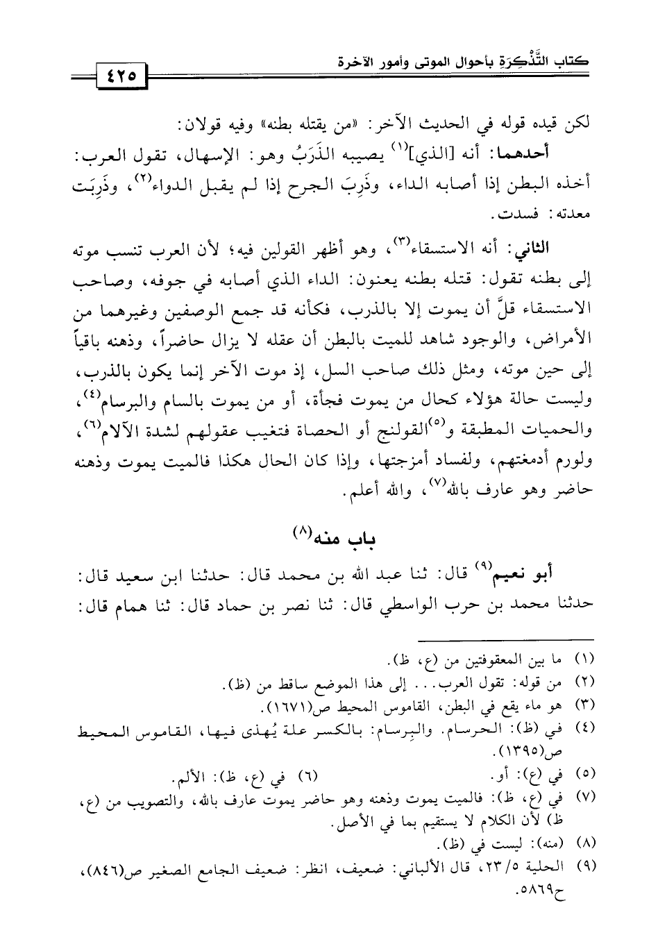 الثاني: أنه الاستسقاء وهو أظهر القولين فيه، لأن العرب تنسب موته إلى بطنه تقول قتله بطنه يعنون الداء الذي أصابه في جوفه وصاحب الاستسقاء قل إن يموت إلا بالذرب فكأنه قد جمع الوصفين وغيرهما من الأمراض والوجود شاهد للميت بالبطن إن عقله لا يزال حاضراً، وذهنه باقياً إلى حين مكوته ومثل ذلك صاحب السل إذ موت الآخر إنما يكون بالذرب، وليست حالة هؤلاء كحال من يموت فجأة أو من يموت بالسام والبرسام، والحميات المطبقة أو القولنج أو الحصاة فتغيب عقولهم لشدة الآلام، ولزوم أدمغتهم، ولفساد أمزجتها، فإذا كان الحال هكذا فالميت يموت وذهنه حاضر وهو عارف.