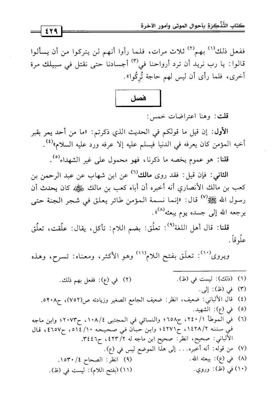 الثاني: فإن قيل: فقد روى مالك «عن ابن شهاب، عن عبد الرحمن بن كعب بن مالك الأنصاري أنه أخبره أن أباه كعب بن مالك كان يحدث أن رسول الله صلى الله عليه وسلم قال: إن نسمة المؤمن طائر يعلق في شجر الجنة حتى يرجعه الله إلى جسده يوم يبعثه» ؟ قلنا: قال أهل اللغة تعلق بضم اللام تأكل.