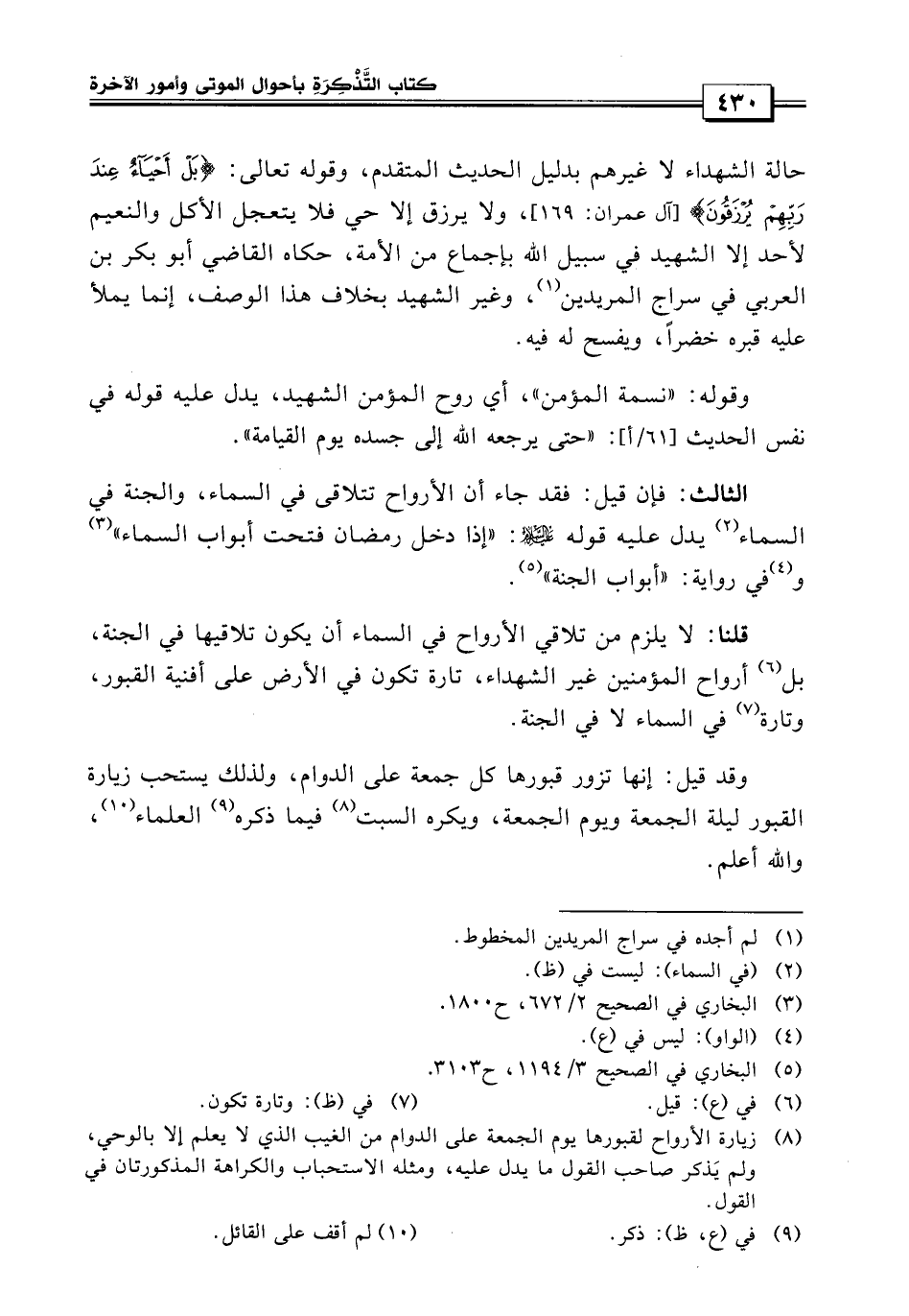 الثالث: فإن قيل: فقد جاء أنه الأرواح تتلاقى في السماء والجنة في السماء يدل على قوله عليه السلام: «إذا دخل رمصان فتحت أبواب السماء» وفي رواية أبواب الجنة؟ قلنا: لا يلزم من تلاقي الأرواح في السماء أن يكون تلاقيها في الجنة، بل أرواح المؤمنين غير الشهداء تارة تكون في الأرض على أفنية القبور، وتارة في السماء لا في الجنة.