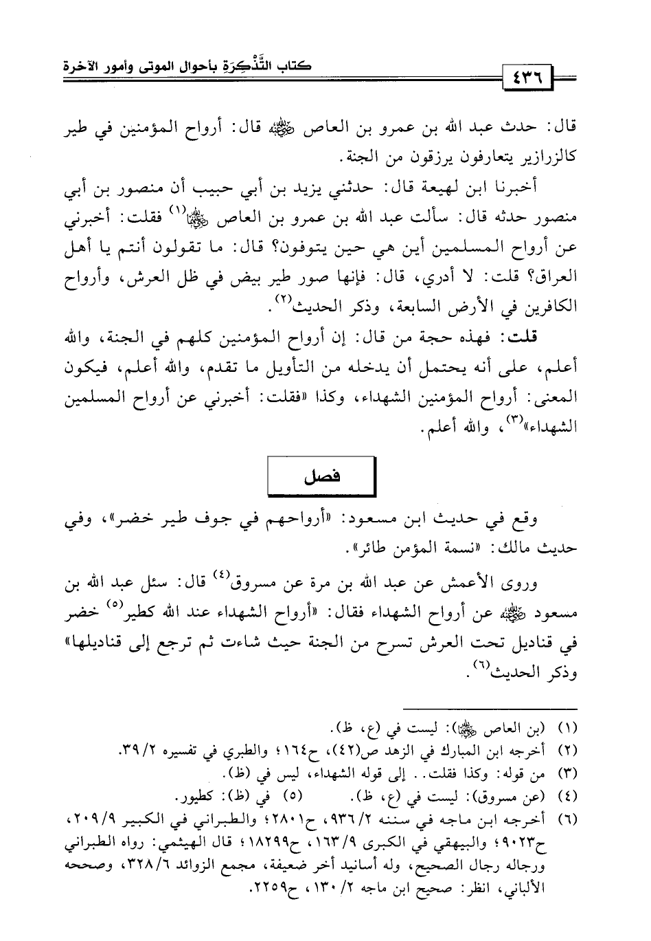 فصل: وقع في حديث ابن مسعود: «أرواحهم في جوف طير خضر» وفي حديث مالك: «نسمة المؤمن طائر» وروى الأعمش عن عبد الله بن مرة قال: سئل عبد الله بن مسعود عن أرواح الشهداء؟ فقال: أرواح الشهداء عند الله كطير خضر في قناديل تحتة العرش تسرح من الجنة حيث شاءت، ثم ترجع إلى قناديلها.