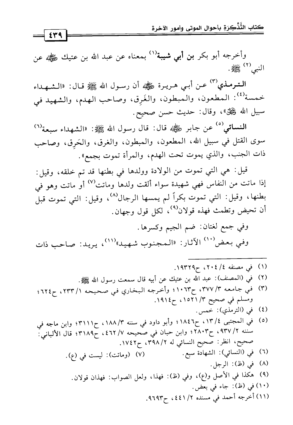 الترمذي «عن أبي هريرة أن رسول الله صلى الله عليه وسلم قال: الشهداء خمسة: المبطون، والمطعون، والغريق، وصاحب الهدم، والشهيد في سبيل الله عز وجل» .