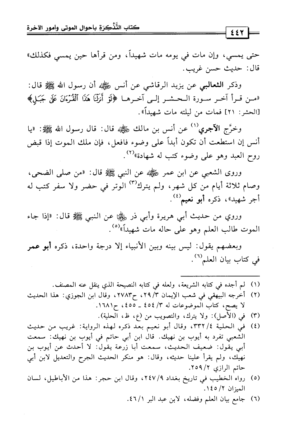 وروى من حديث «أبي هريرة وأبي ذر عن النبي صلى الله عليه وسلم قال: إذا جاء الموت طالب العلم وهو على حاله مات شهيداً» .