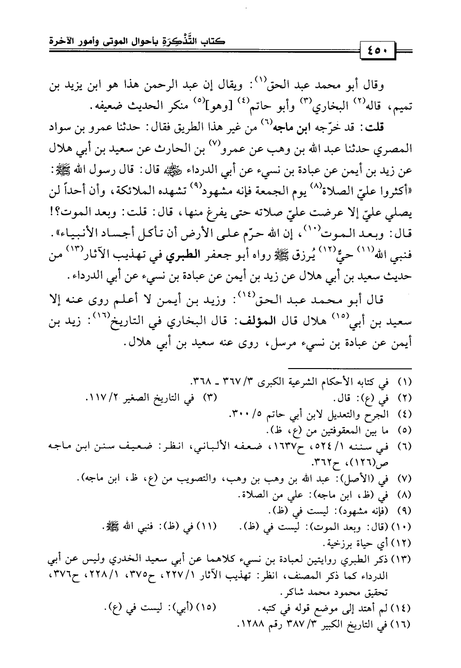 قلت: وقد خرجه ابن ماجه من غير هذا الطريق فقال: «حدثنا عمرو بن سواد المصري، حدثنا عبد الله بن وهب عن عمرو بن الحارث، عن سعيد بن أبي هلال، عن زبد بن أيمن عن عبادة بن نسيء، عن أبي الدرداء قال: قال رسول الله صلى الله عليه وسلم: أكثروا علي الصلاة يوم الجمعة، فإنه مشهود تشهده الملائكة وإن أحداً لمن يصلي علي إلا عرضت علي صلاته حتى يفرغ منها قال قلت: وبعد الموت؟ قال: وبعد الموت إن الله حرم على الأرض أن تأكل الأجساد الأنبياء» فنبي الله حي يرزق صلى الله عليه وسلم.