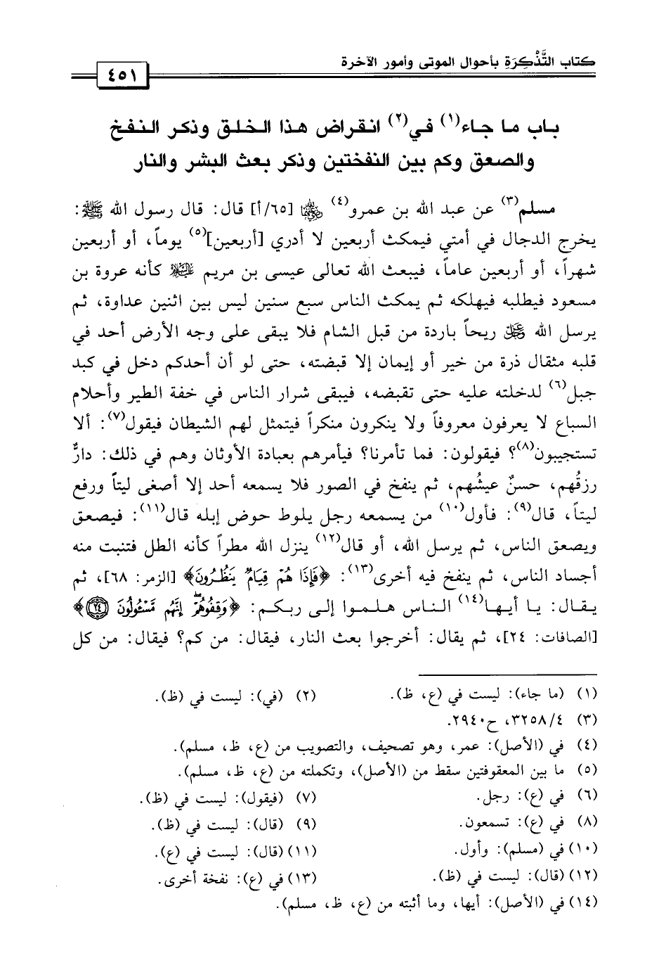 باب في انقراض هذا الخلق وذكر النفخ والصعق وكم بين النفختين؟ وذكر البعث والنشر والنار