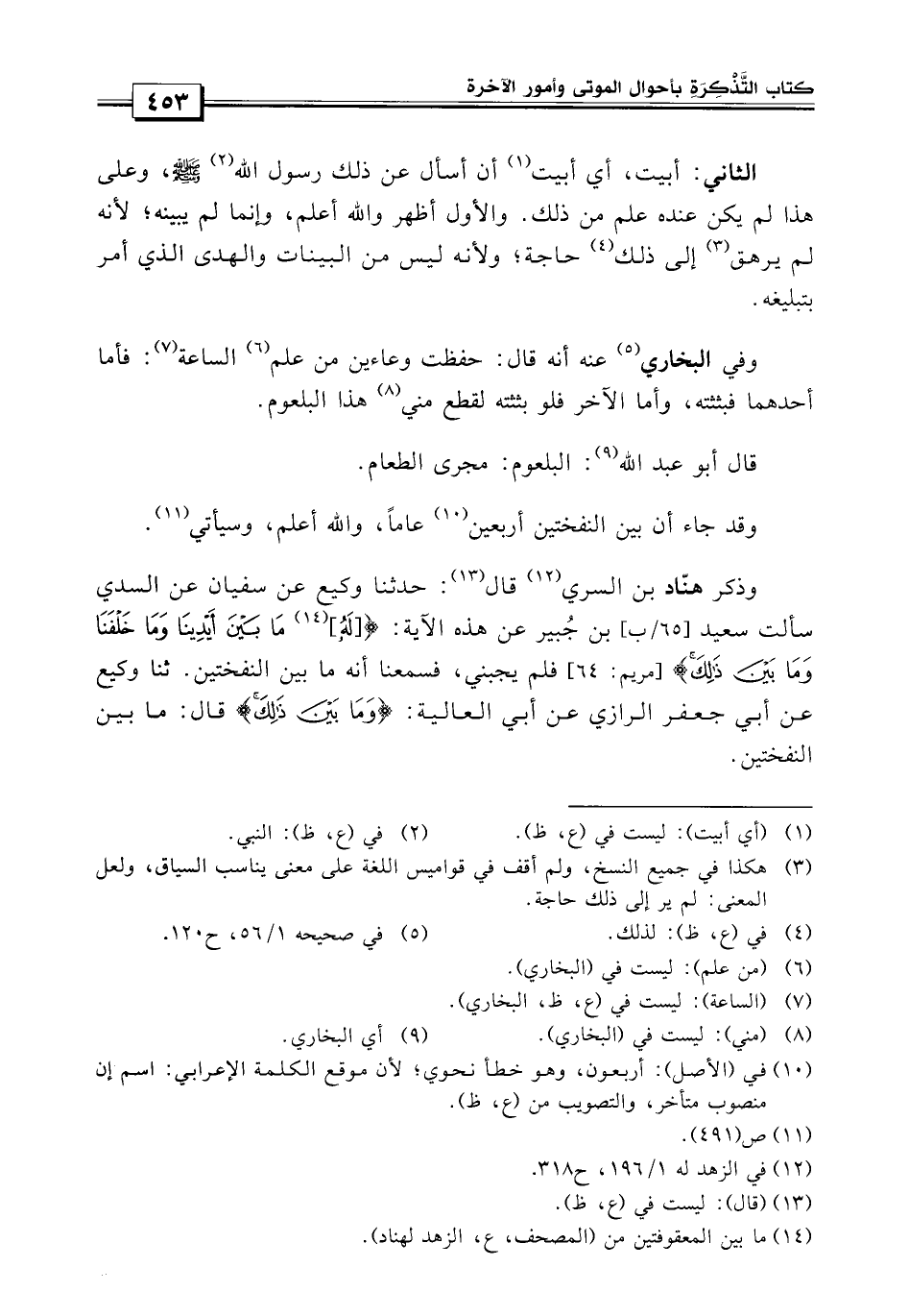 والأول أظهر وإنما لم يبينه لأنه لم ترهق لذلك حاجة، ولأنه ليس من البينات والهدى الذي أمر بتبليغه، وفي البخاري عنه أنه قال: حفظت وعاءين من علم فأما أحدهما فبثثته، وأما الآخر فلو بثثته لقطع مني هذا البلعوم، قال أبو عبد الله: البلعوم: مجرى الطعام، وقد جاء أن بين النفختين أربعين عاماً، والله أعلم وسيأتي.