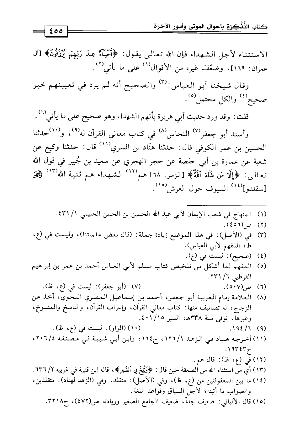 قلت: قد ورد حديث أبي هريرة بأنهم الشهداء وهو الصحيح على ما يأتي: وأسند النحاس في كتاب معاني القرآن له حدثنا الحسين بن عمر الكوفي قال: حدثنا هناد بن السرى قال: حدثنا وكيع، عن شعبة عمارة ابن أبي حفصة، عن حجر الهجري، عن سعيد بن جبير في قول الله عز وجل {إلا من شاء الله} قال: هم الشهداء هم ثنية الله عز وجل متقلدو السيوف حول العرش.