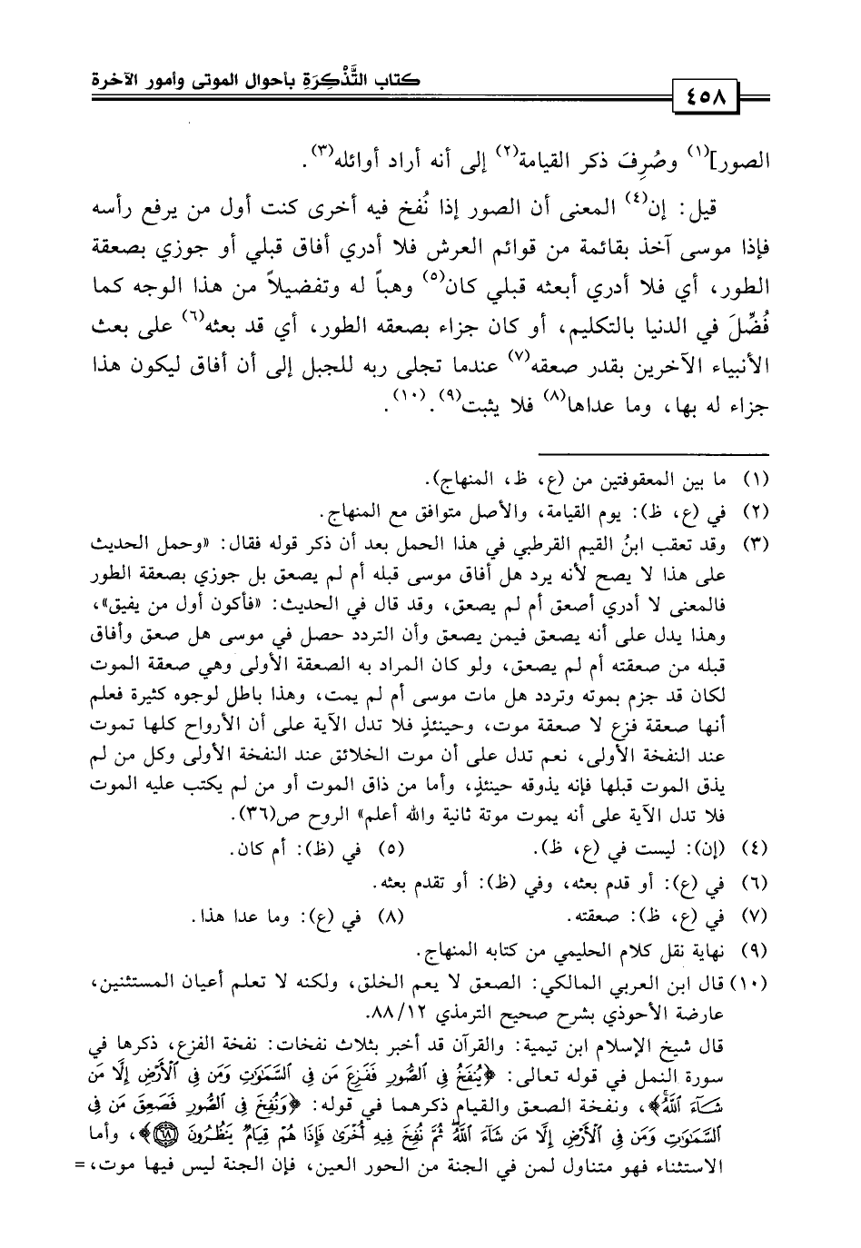 وصرف ذكر يوم القيامة إلى أنه أراد أوائله قيل: المعنى: أن الصور إذا نفخ فيه أخرى كنت أول من يرفع رأسه، فإذا بموسى آخذ بقائمة من قوائم العرش، فلا أدري أفاق قبلي أو جوزي بصعقة الطور؟ أي فلا أدري أبعثه قبلي كان وهباً له وتفصيلاً من هذا الوجه، كما فضل في الدنيا بالتكليم أو كان جزاء له بصعقة الطور، أي قدم بعثه على بعث الأنبياء الأخرين بقدر صعقته عندما تجلى ربه للجبل إلى أن أفاق ليكون هذا جزاء له بها.