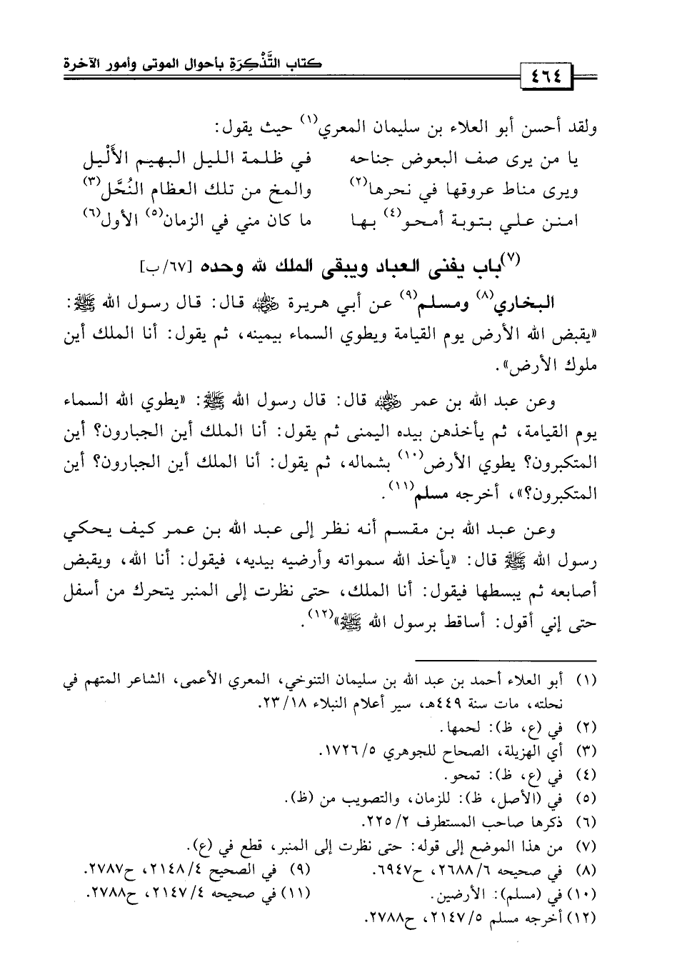البخاري ومسلم «عن أبي هريرة قال: قال رسول الله صَلَّى اللهُ عَلَيْهِ وَسَلَّمَ: يقبض الله الأرض يوم القيامة ويطوي السماء بيمينه، ثم يقول: أنا الملك أين ملوك الأرض» ؟ و «عن عبد الله بن عمر قال: قال رسول الله صَلَّى اللهُ عَلَيْهِ وَسَلَّمَ: يطوي الله السماء يوم القيامة.