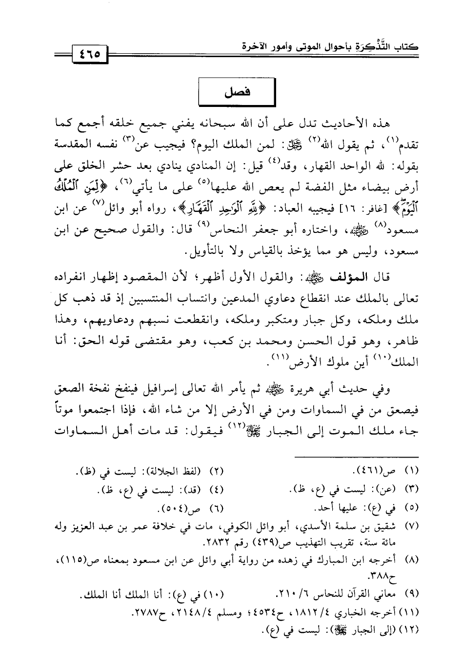 فصل: هذه الأحاديث تدل على أن الله سبحانه يفني جميع خلقه أجمع كما تقدم ثم يقول الله عز وجل: {لمن الملك اليوم} فيجيب نفسه المقدسة بقوله: {لله الواحد القهار} .
