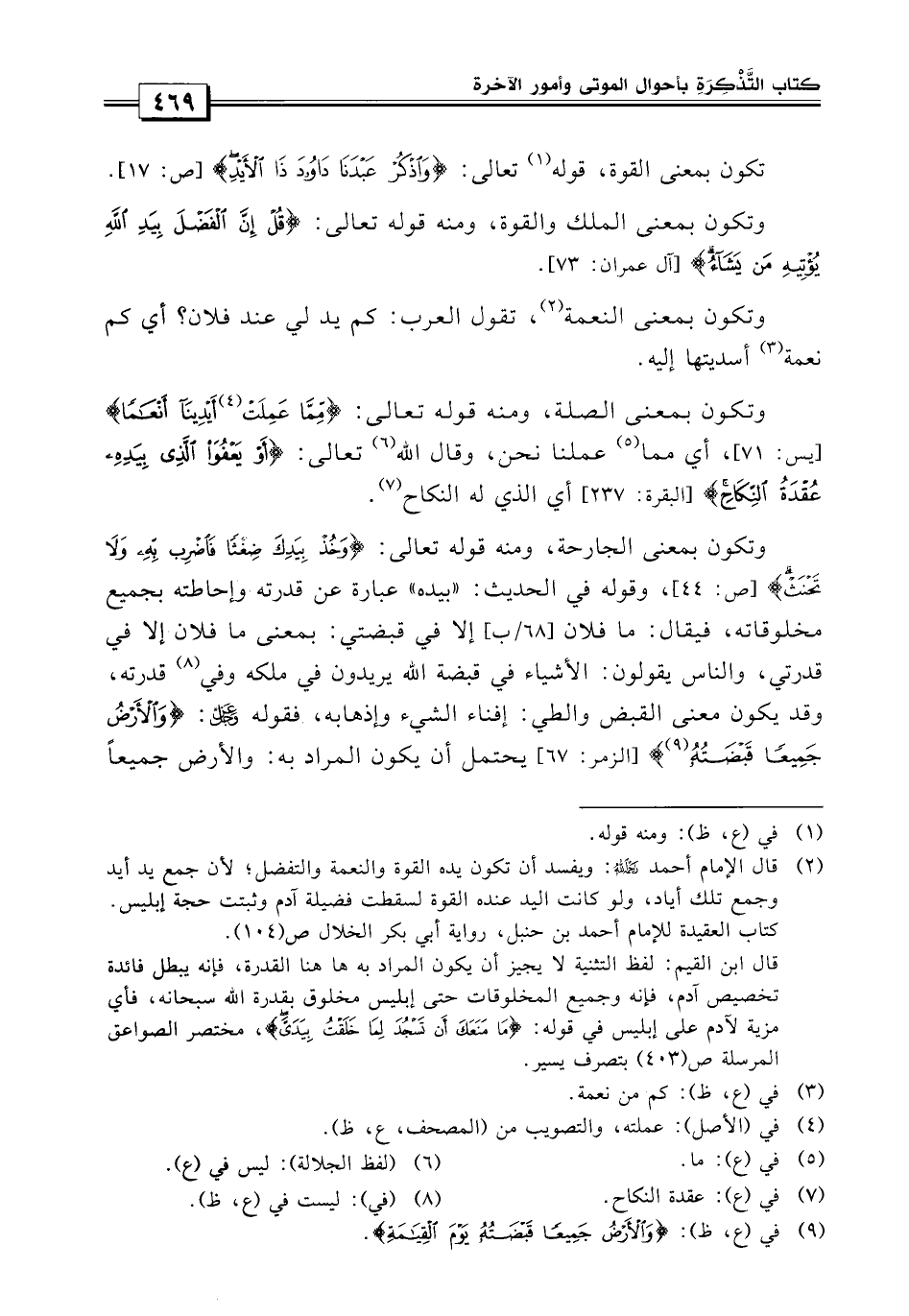 والناس يقولون: الأشياء في قبضة الله يريدون في ملكه وقدرته، وقد يكون معنى القبض والطي: إفناء الشيء وإذهابه فقوله عز وجل: {والأرض جميعاً قبضته يوم القيامة} يحتمل أن يكون المراد به الأرض جميعاً