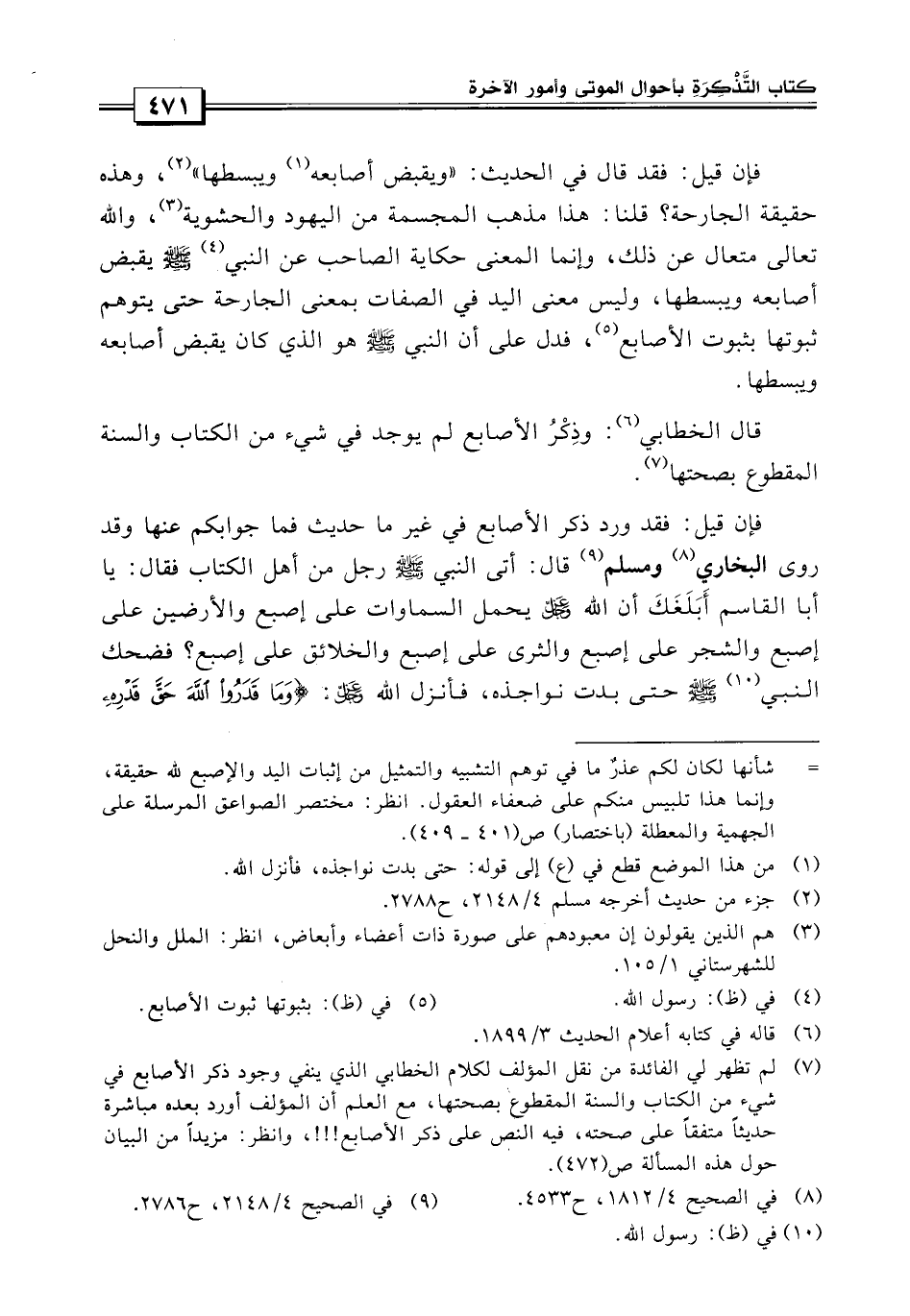 فإن قيل: فقد ورد ذكر الأصابع في غير ما حديث فما جوابكم عنه؟ فقد روى البخاري ومسلم قال: أتى النبي صَلَّى اللهُ عَلَيْهِ وَسَلَّمَ رجل من أهل الكتاب فقال: يا أبا القاسم أبلغك أن الله تعالى يحمل السموات على أصبع، والأرضين على أصبع، والشجر على أصبع، والثرى على أصبع، والخلائق على أصبع؟ فضحك رسول الله صَلَّى اللهُ عَلَيْهِ وَسَلَّمَ حتى بدت نواجذه فأنزل الله عز وجل {وما قدروا الله حق قدره،